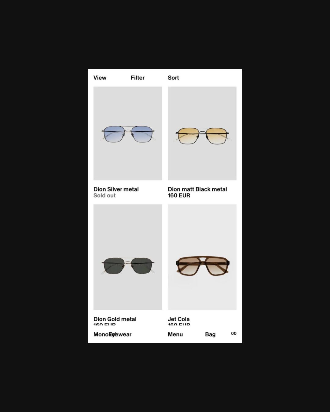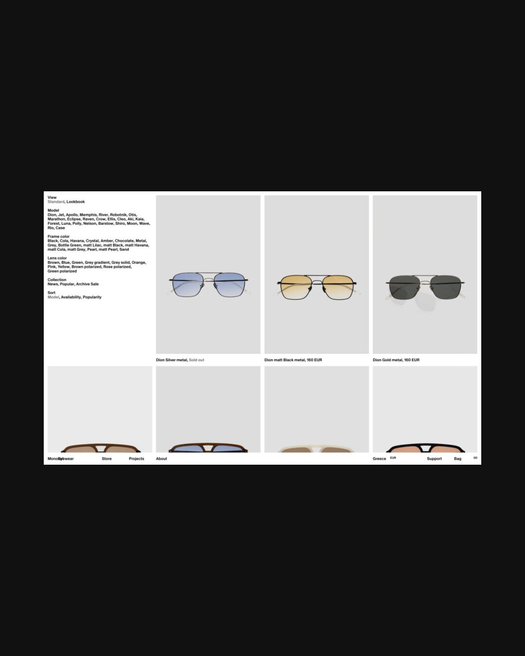 0547 monokel-eyewear.com Fashion, Clean, Grid, Large Scale, Light, Small Typography, Black, Silver, White, Sweden. Design: Lundgren+Lindqvist. Development: Lundgren+Lindqvist. (05-12-2022) ←Close