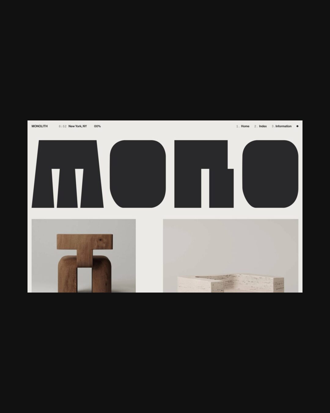 1030 monolith.nyc Furniture, Big Title, Bold, Clean, Gray, Grid, Large Scale, Light, Minimal, Sans Serif Typeface, Simple, Black, White, USA. Design: Cusp. Development: Nathan Dallaire. (25-11-2024) ←Close