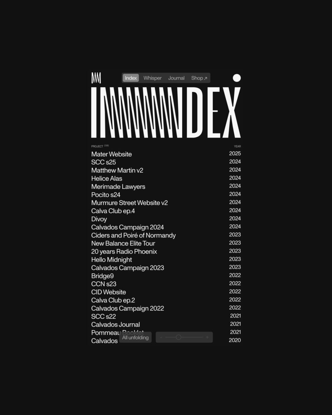 1261 murmure.me Design, Big Title, Big Typography, Dark, Grid, Large Scale, List, Sans Serif Typeface, Black, White, France. Design: MURMURE. Development: MURMURE. (19-09-2025) ←Close