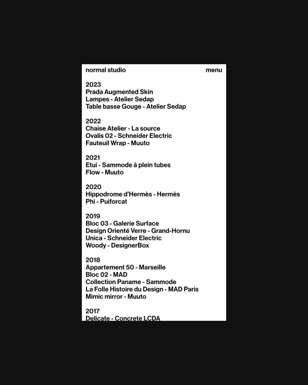 1058 normalstudio.fr Industrial Designer, Animations, Bold, Brutalist, Clean, Grid, Large Scale, Light, Minimal, Sans Serif Typeface, Scroll Events, White Space, Silver, White, France. Design: Building Paris, Loïc Altaber. Development: F451, Quentin Creuzet. (08-01-2025) ←Close