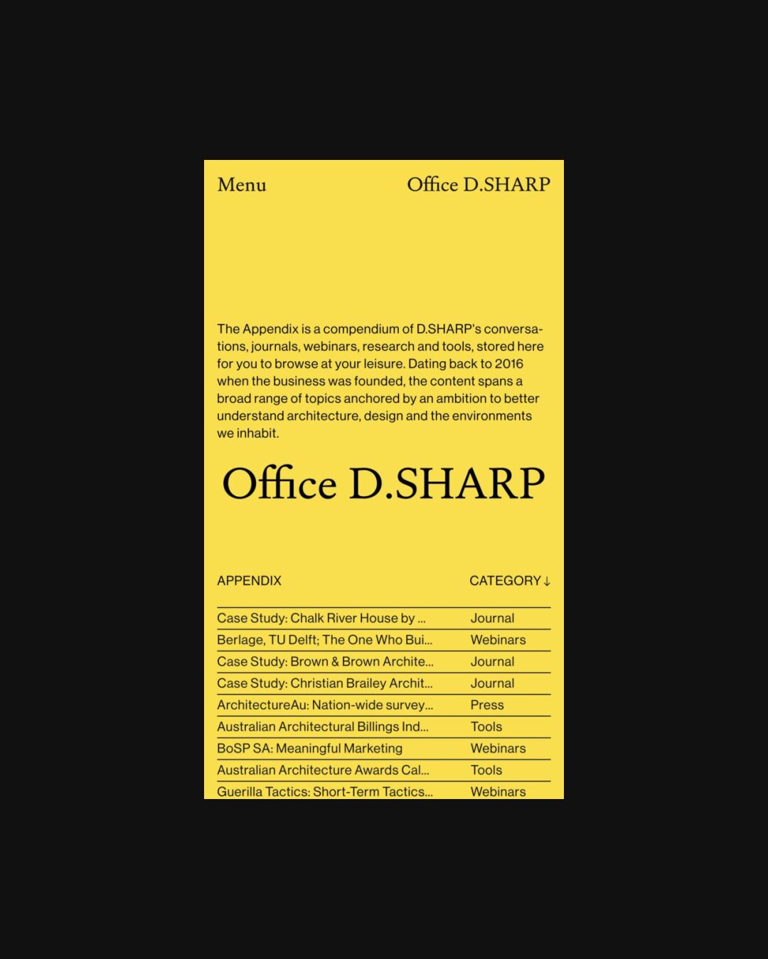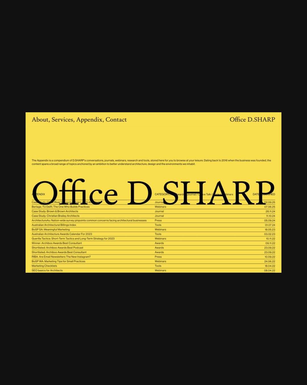 1300 officedavesharp.com Marketing, Big Typography, Bright, Clean, Large Scale, Layered, Light, List, Serif Typeface, Simple, Technical, White Space, Coral, Lemon, Australia. Design: Studio HiHo. Development: Bien Studio. (06-11-2025) ←Close