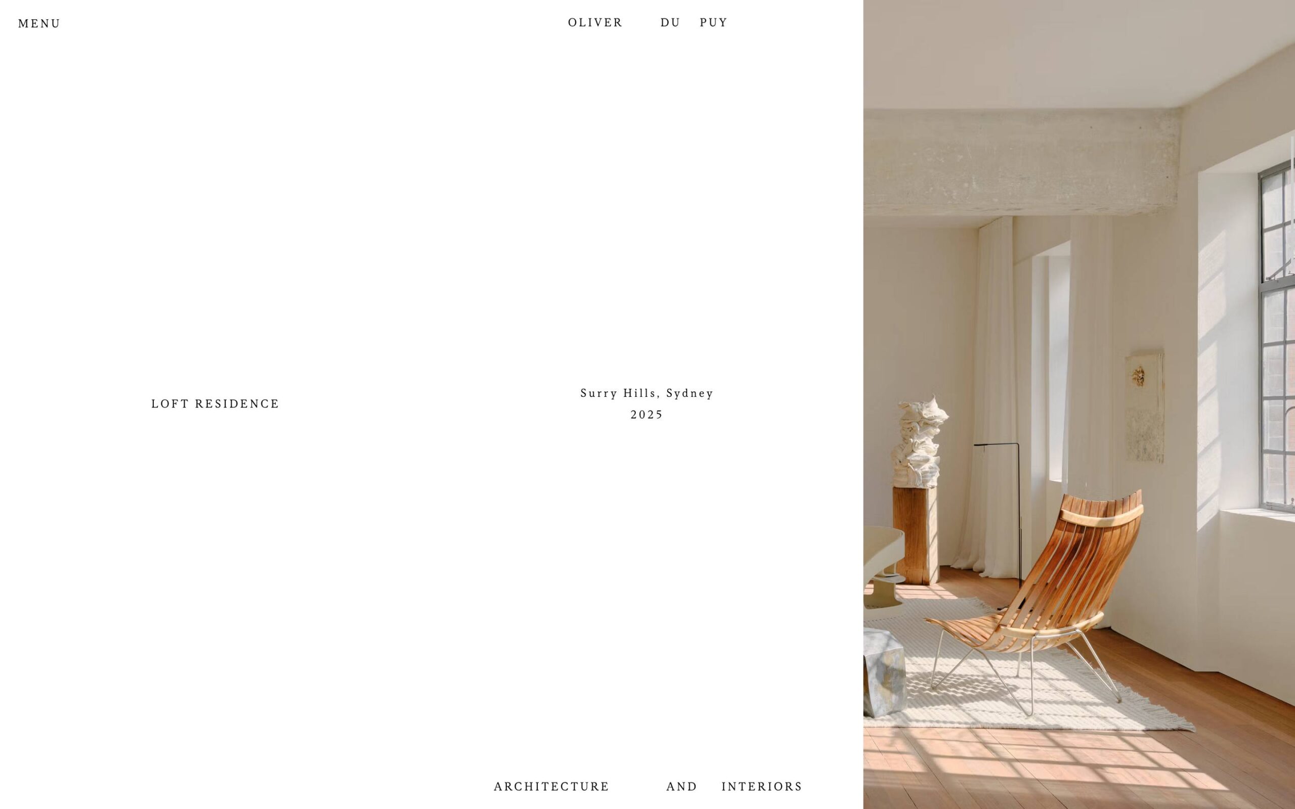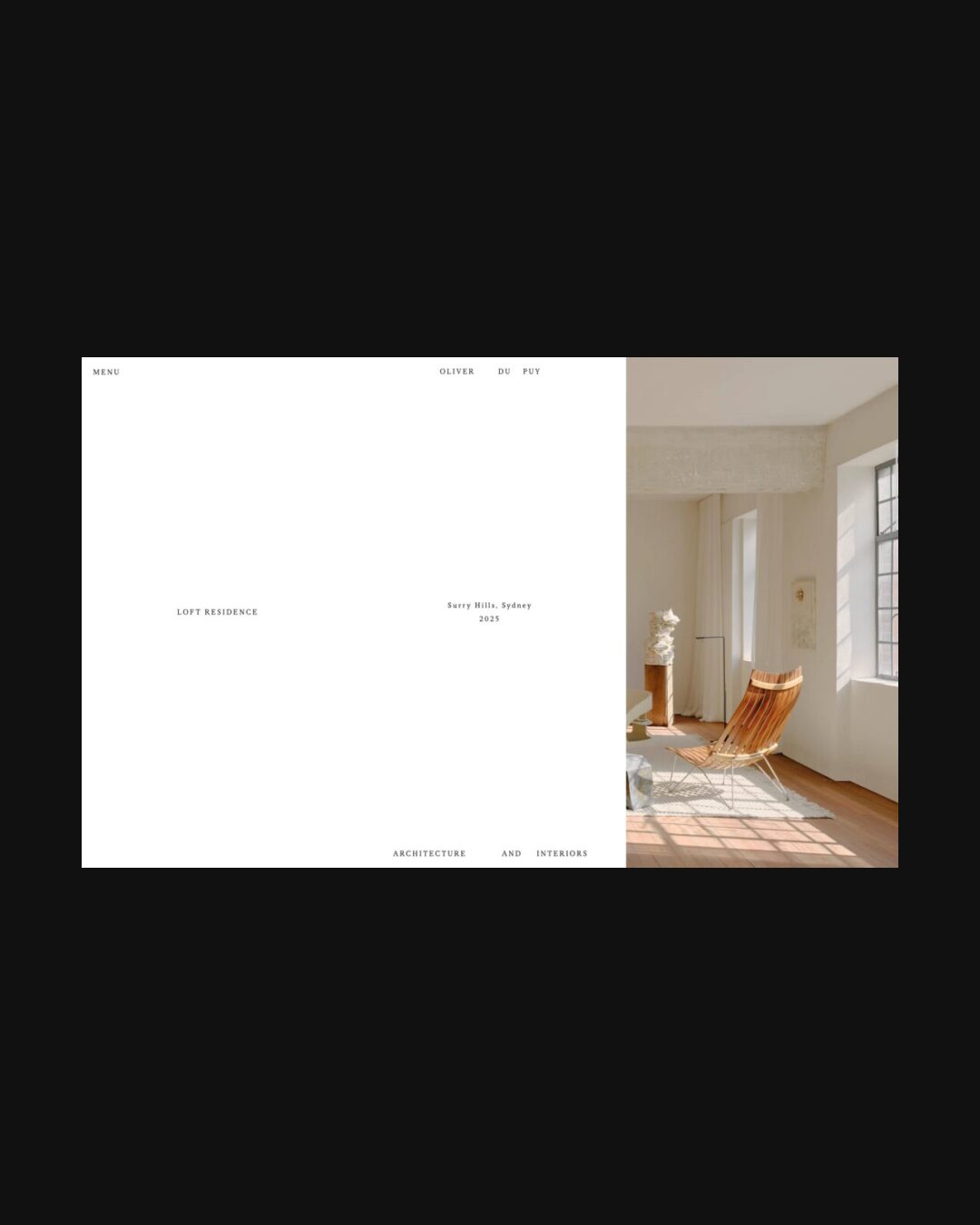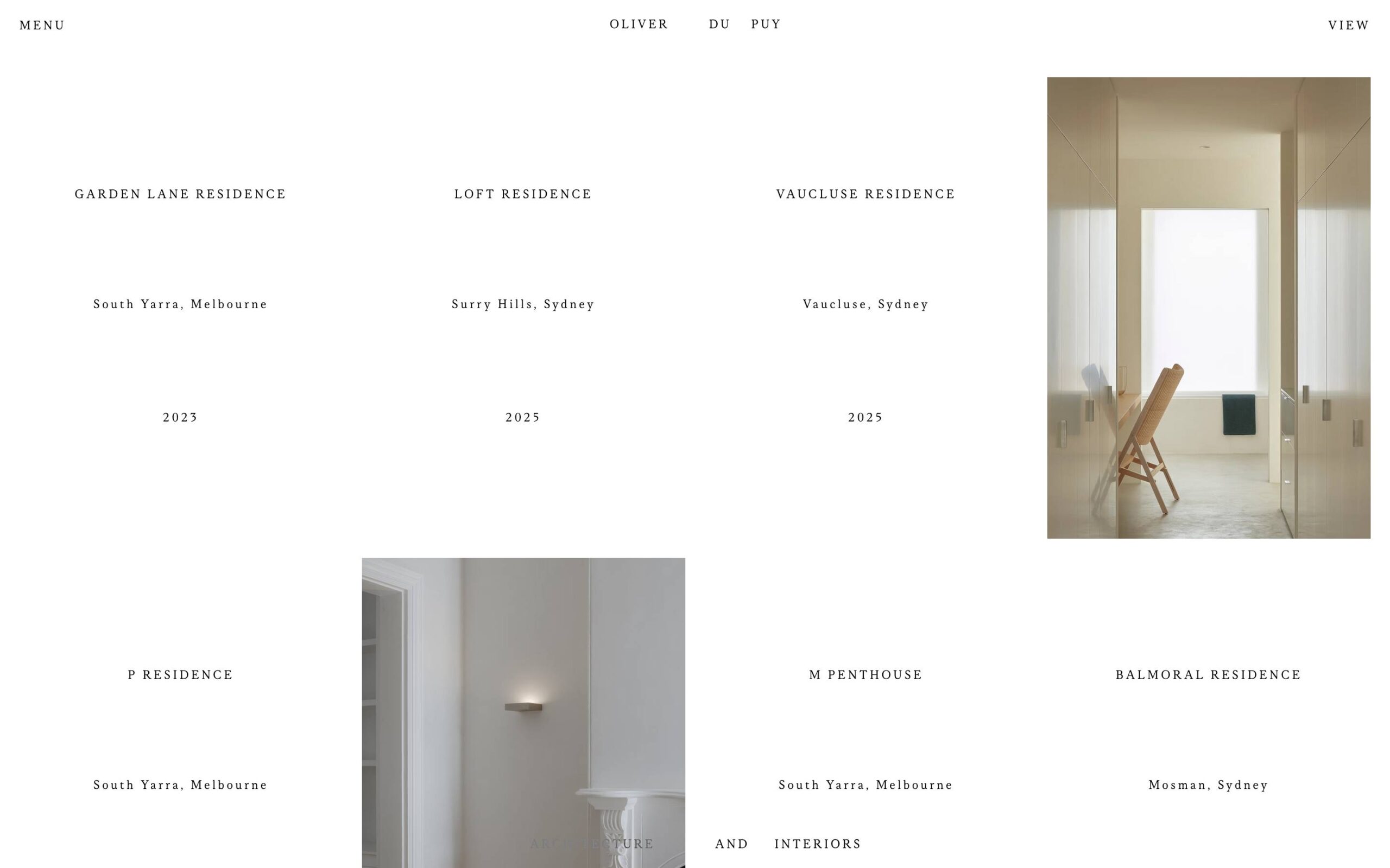 1305 oliverdupuy.com Architecture, Bright, Clean, Grid, Large Scale, Layered, Light, Minimal, Mixed Style Typefaces, Simple, Small Typography, White Space, Chocolate, Coffee, Australia. Design: SCCO Studio. Development: Sasha Burger. (12-11-2025) ←Close
