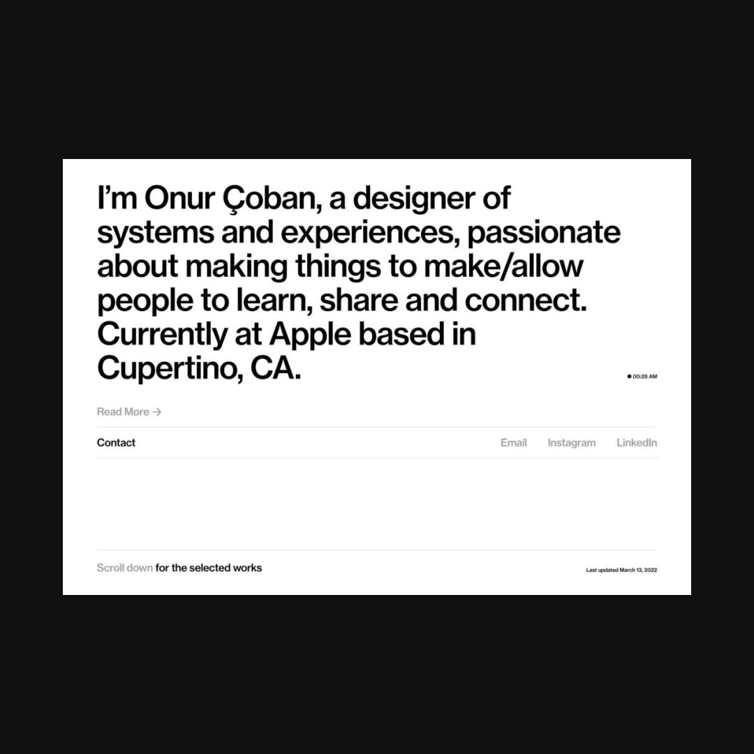 0446 onur.design Design, Animations, Big Typography, Clean, Creative Layout, Large Scale, Light, Scroll Events, Simple, Typographic, Black, White, USA. Design: Onur Çoban. Development: Onur Çoban. (07-05-2022) ←Close