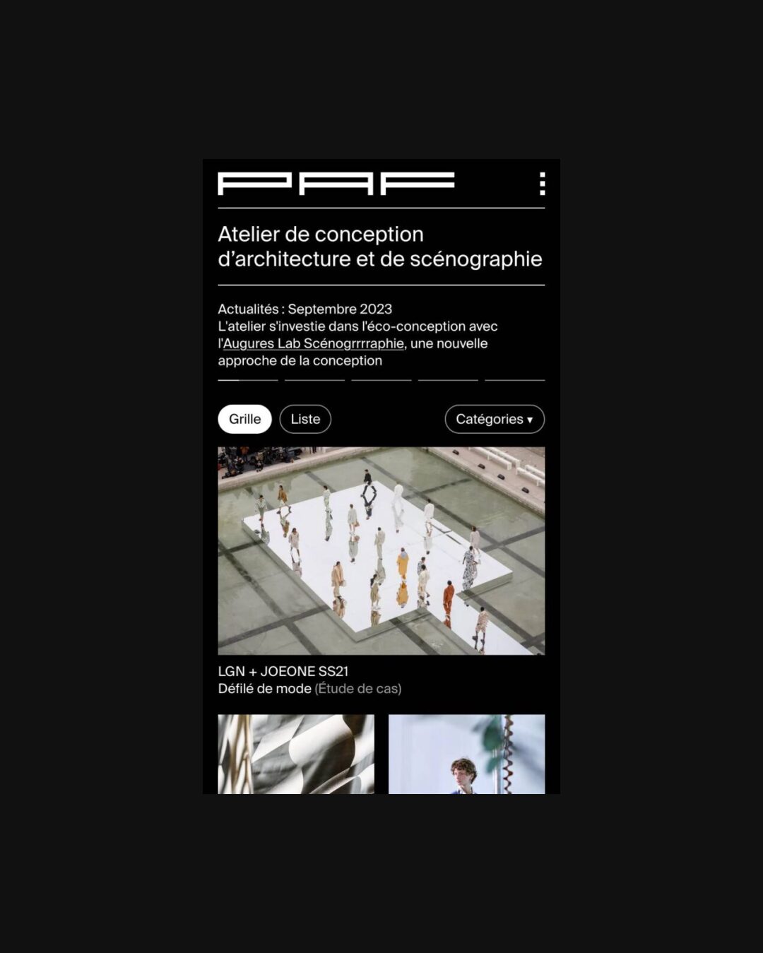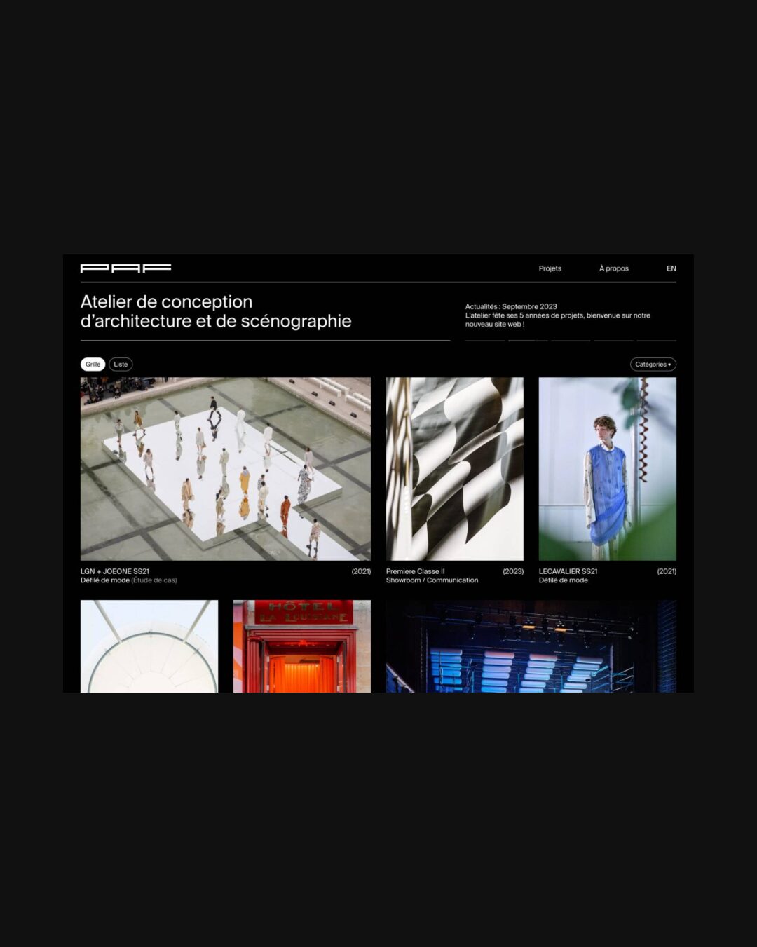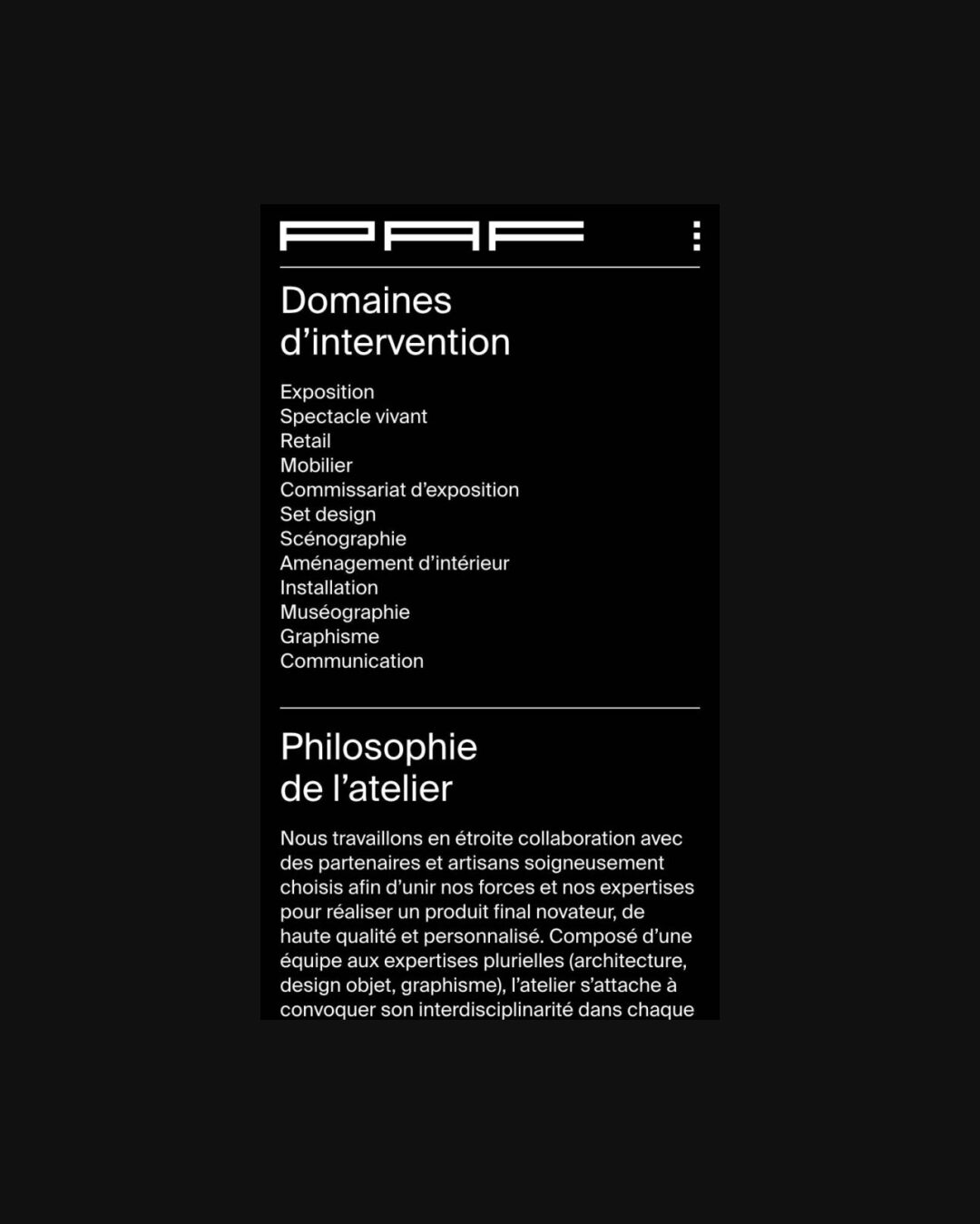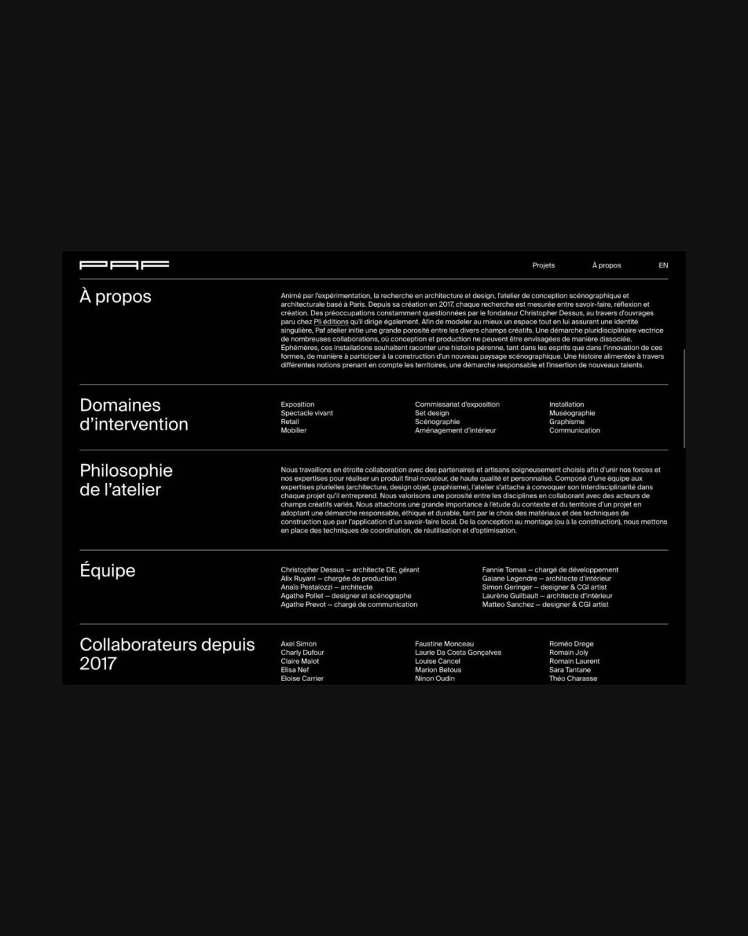 0738 pafatelier.com Architecture, Big Title, Brutalist, Clean, Custom Scroll, Dark, Large Scale, Scroll Events, Black, White, France. Design: Studio Fables. Development: Studio Fables. (20-10-2023) ←Close