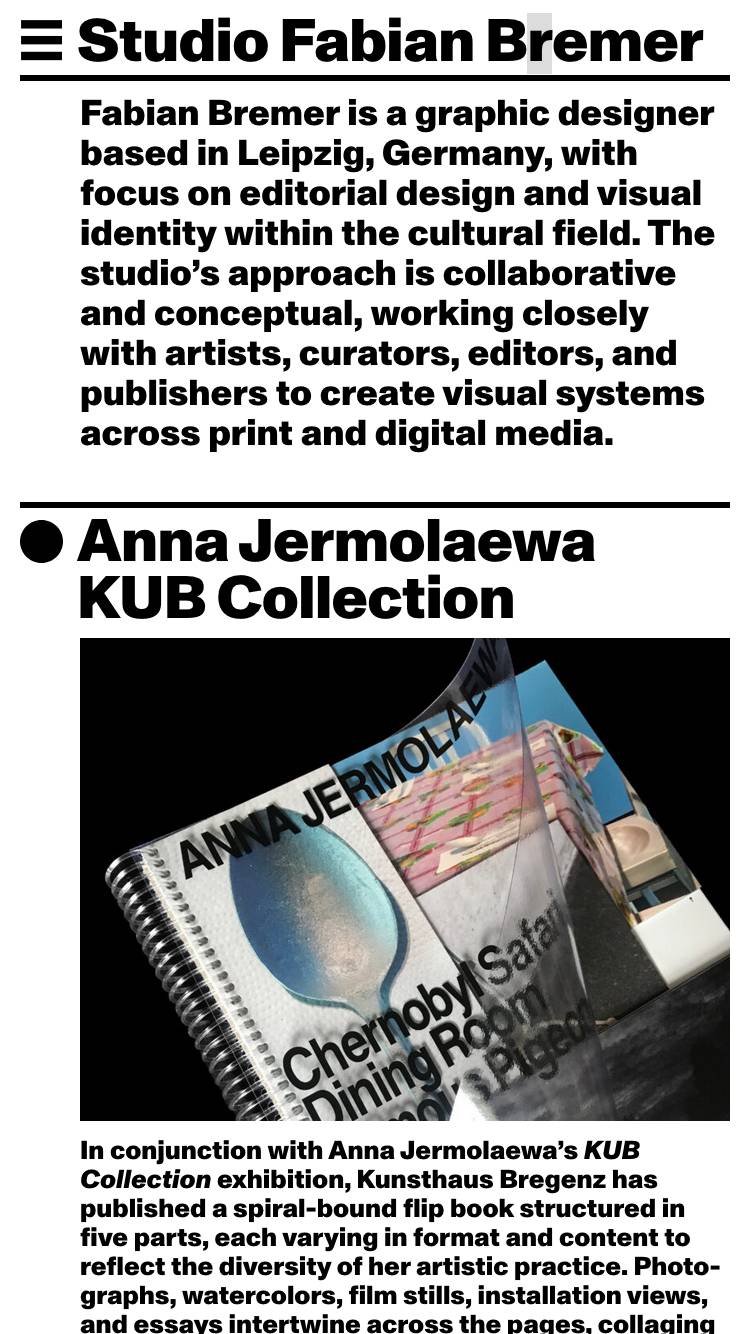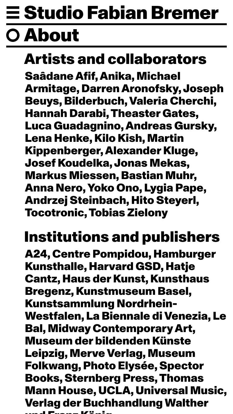 1238 fabianbremer.com Graphic Design, Big Typography, Blur, Brutalist, Sans Serif Typeface, Slider, Sticky Elements, Black, White, Germany. Design: Fabian Bremer. Development: Mario Helbing. (21-08-25) Permalink, Esc