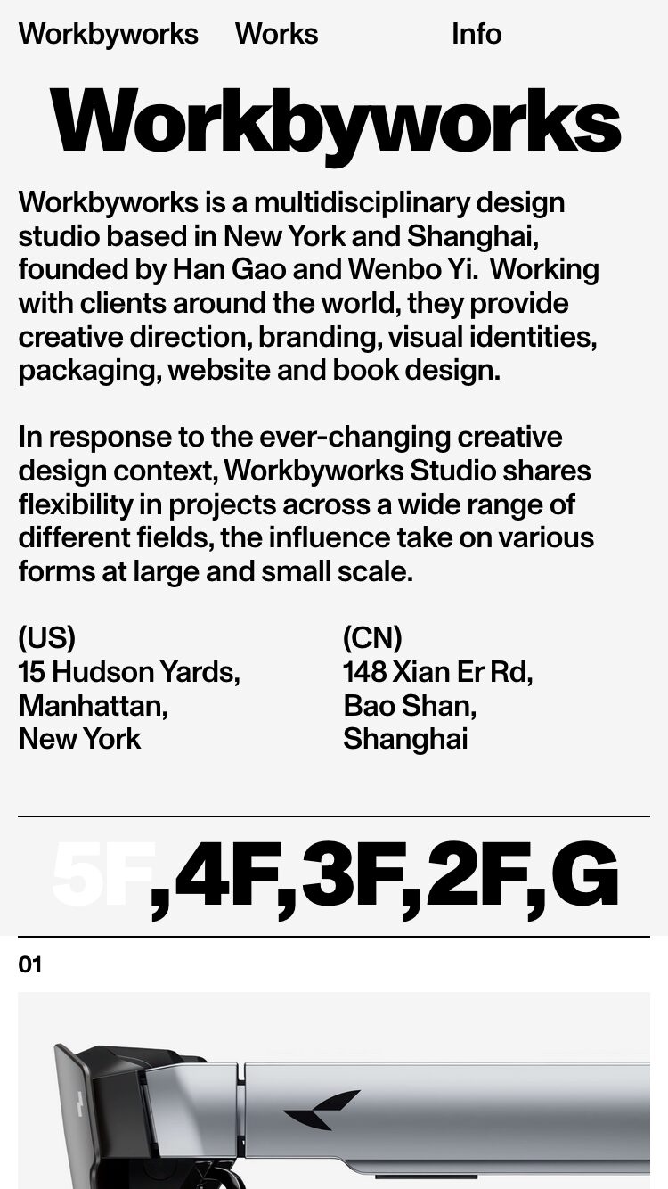 0415 workbyworks.studio Design, Big Images, Big Title, Big Typography, Bold, Clean, Gray, Large Scale, Light, Page Transitions, Scroll Events, Table, White Space, Black, Peach, White, USA. Design: Workbyworks. Development: Workbyworks. (08-06-22) Permalink, ←Esc