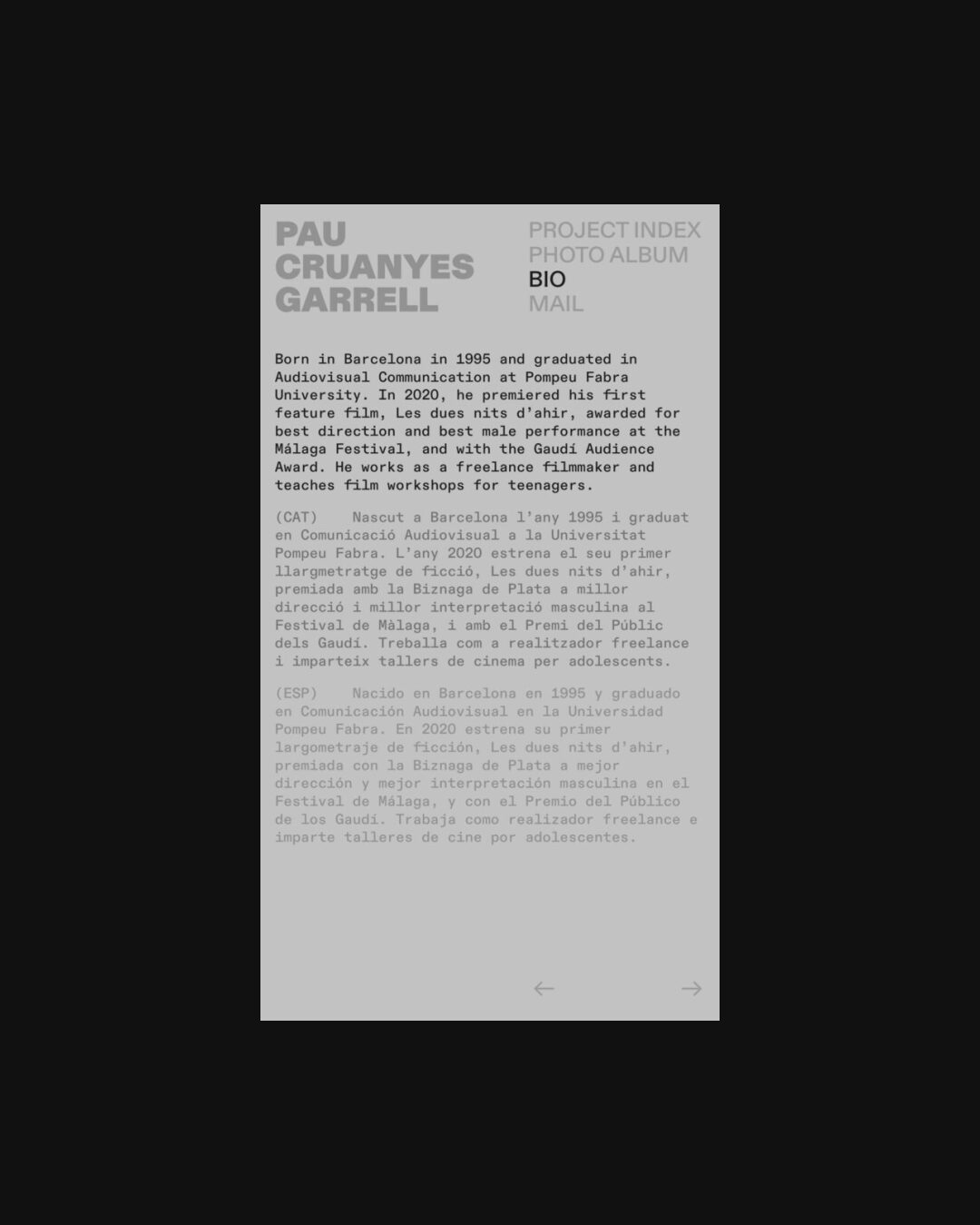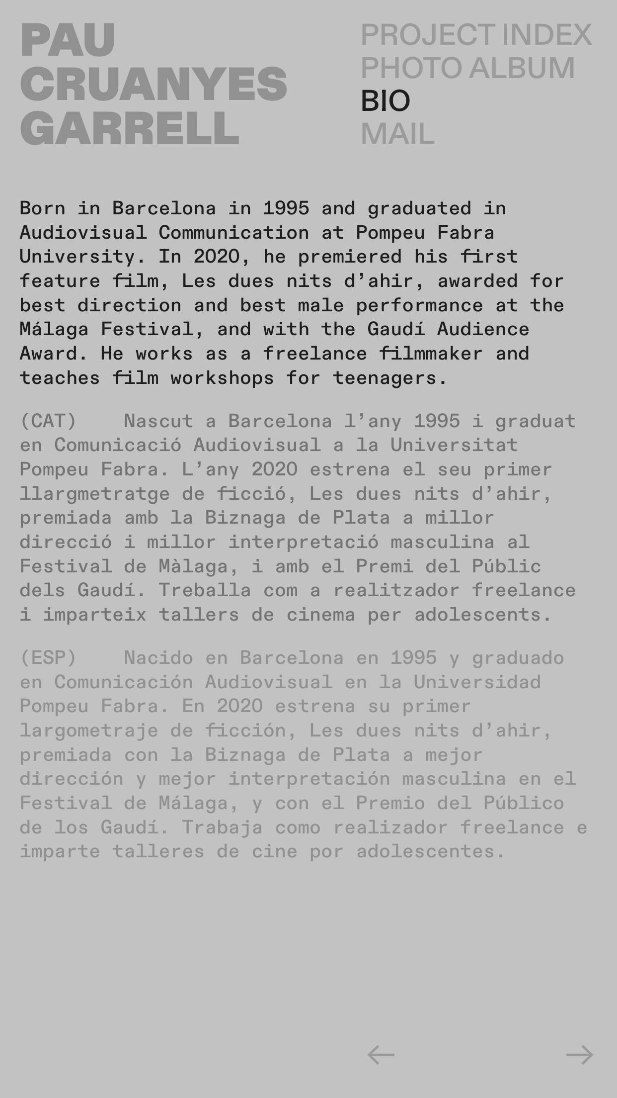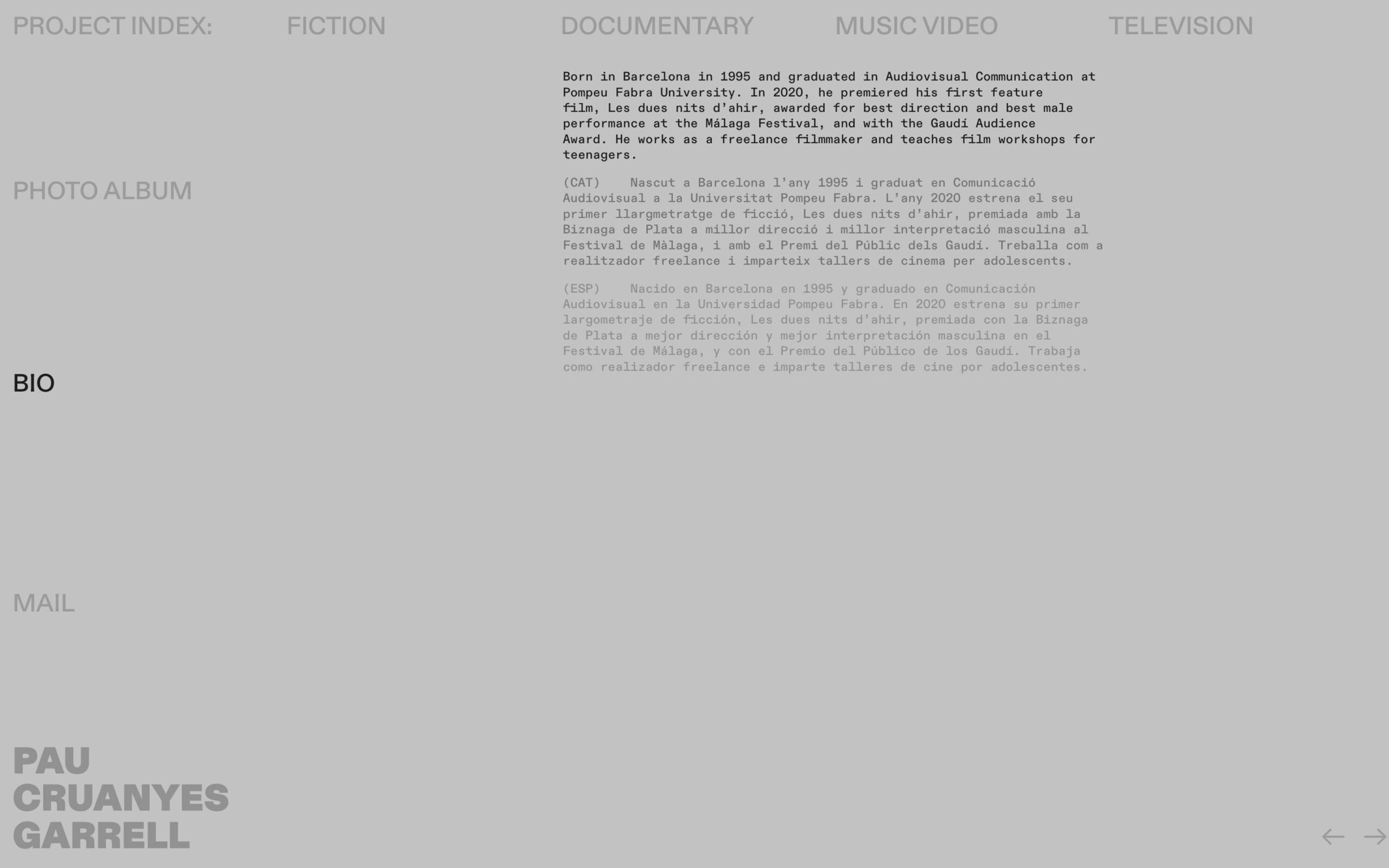 1189 paucruanyesgarrell.com Director, Big Title, Big Typography, Bold, Bright, Colorful, Custom Cursor, Grid, Large Scale, Light, Mixed Style Typefaces, Mono Typeface, Sans Serif Typeface, Video, Gray, White, Spain. Design: Ignasi Àvila Padró. Development: Ignasi Àvila Padró. (14-10-2025) ←Close