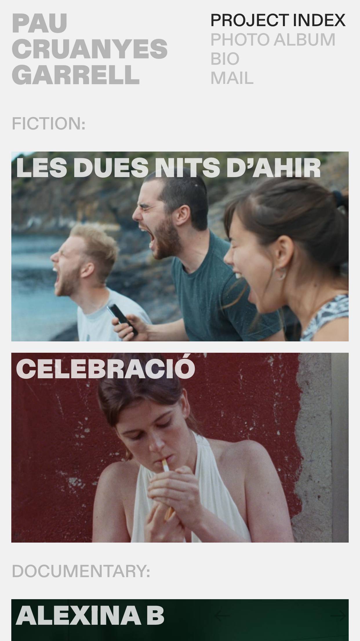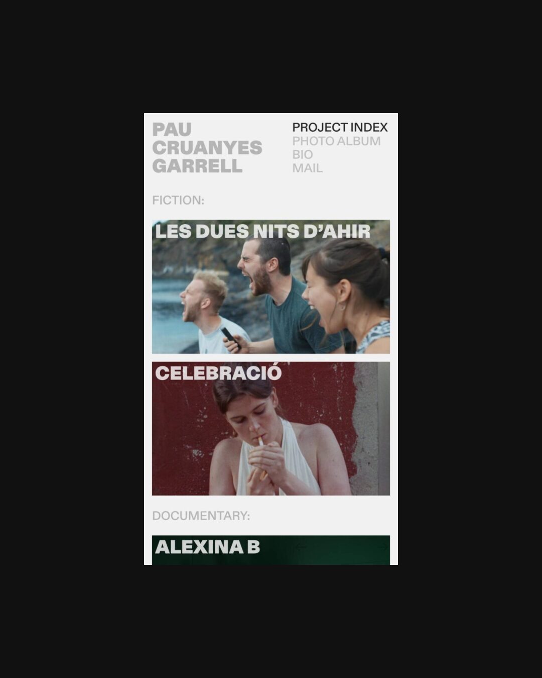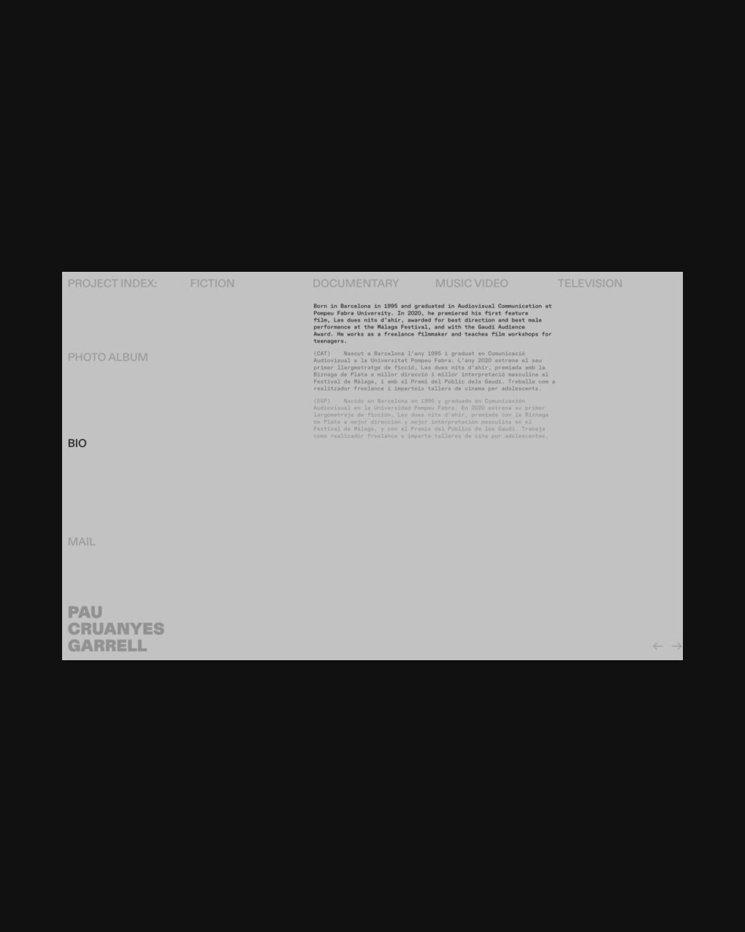 1189 paucruanyesgarrell.com Director, Big Title, Big Typography, Bold, Bright, Colorful, Custom Cursor, Grid, Large Scale, Light, Mixed Style Typefaces, Mono Typeface, Sans Serif Typeface, Video, Gray, White, Spain. Design: Ignasi Àvila Padró. Development: Ignasi Àvila Padró. (14-10-2025) ←Close