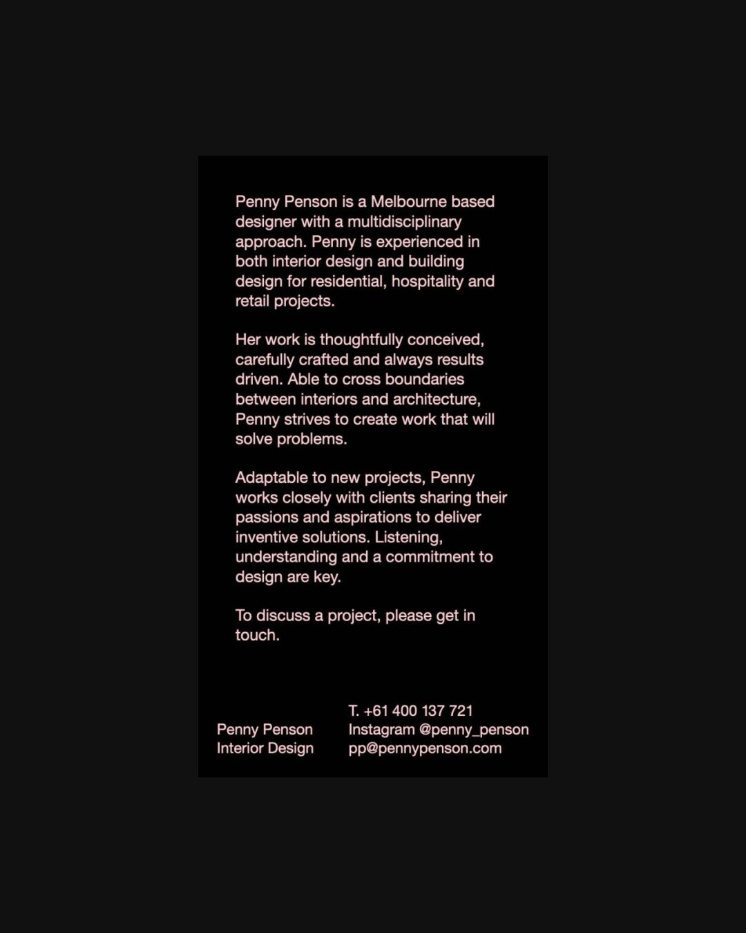 0110 pennypenson.com Design, Big Typography, Colorful, Creative Layout, Grid, Light, One Page, Simple, Typographic, White Space, Black, Pink, Australia. Design: Penny Penson. Development: Penny Penson. (11-04-2018) ←Close