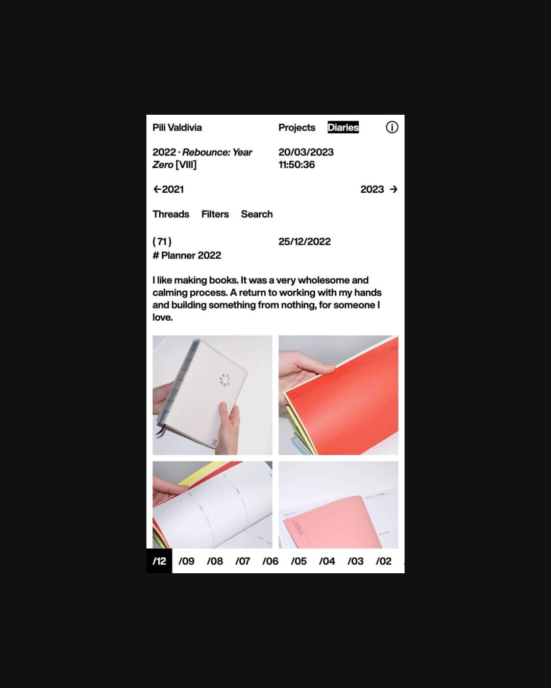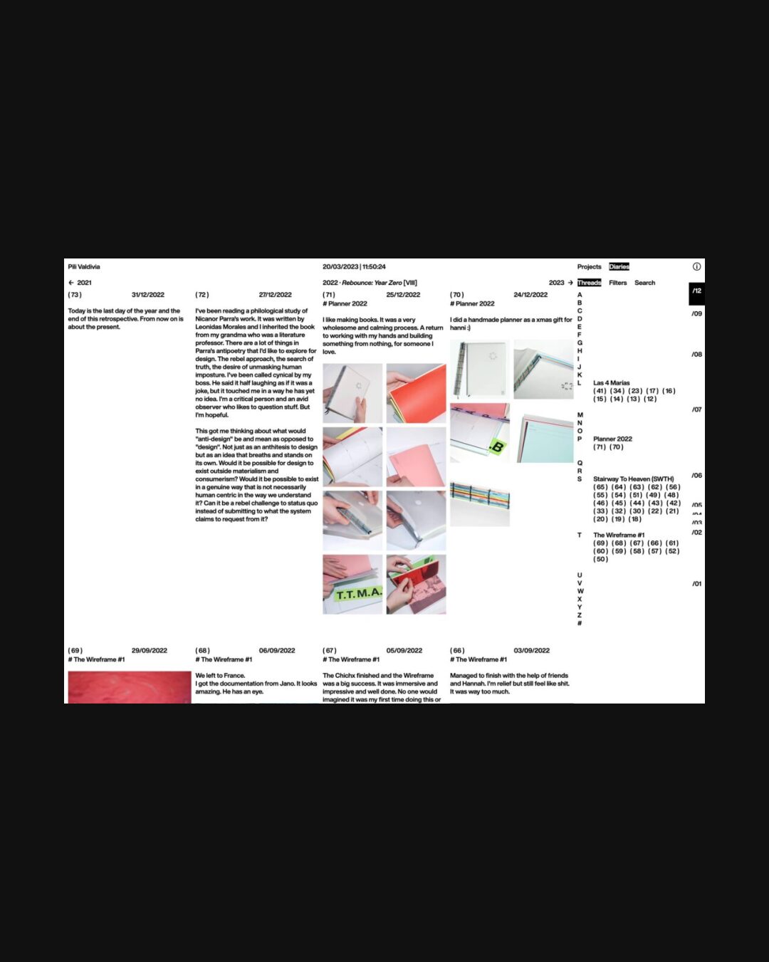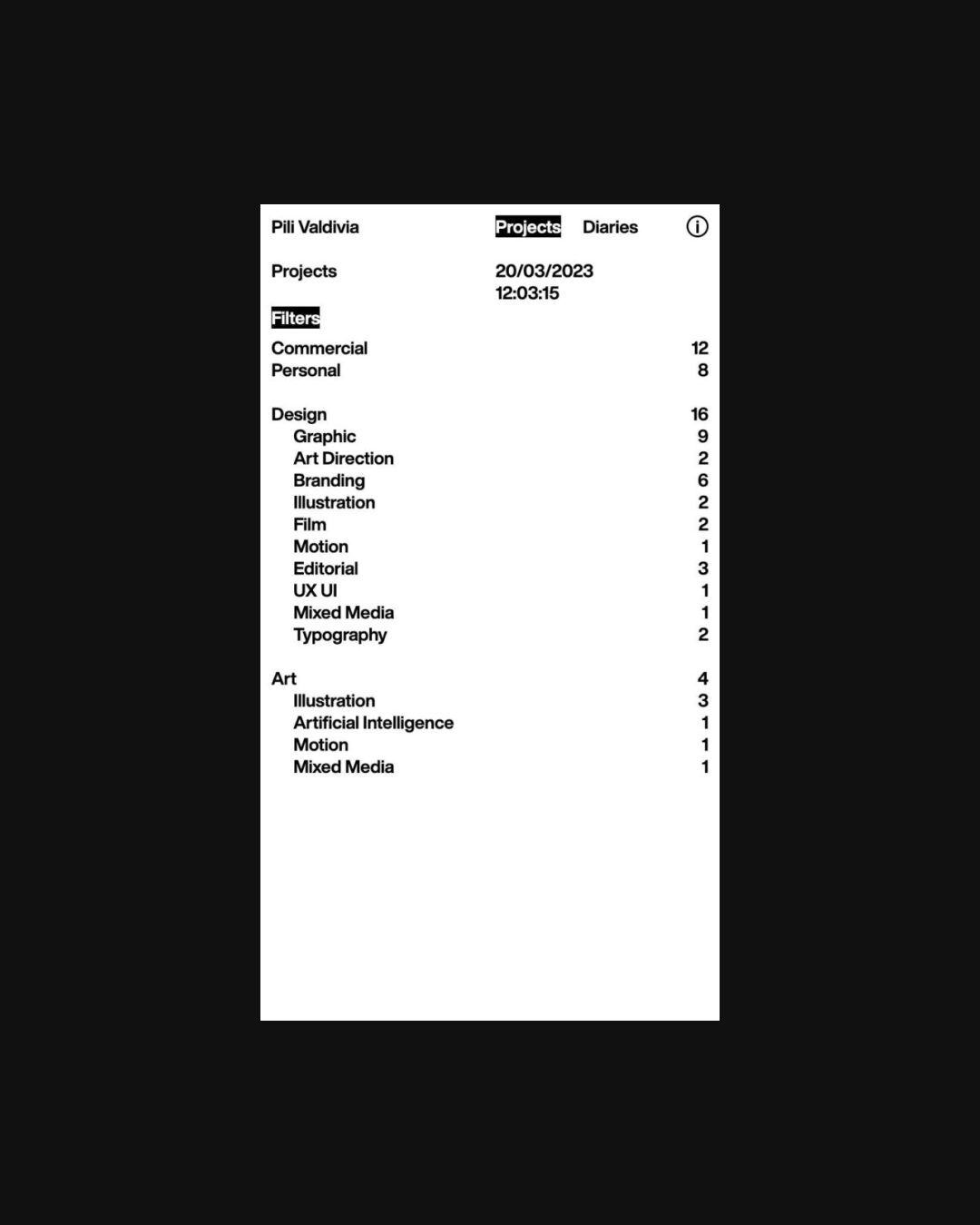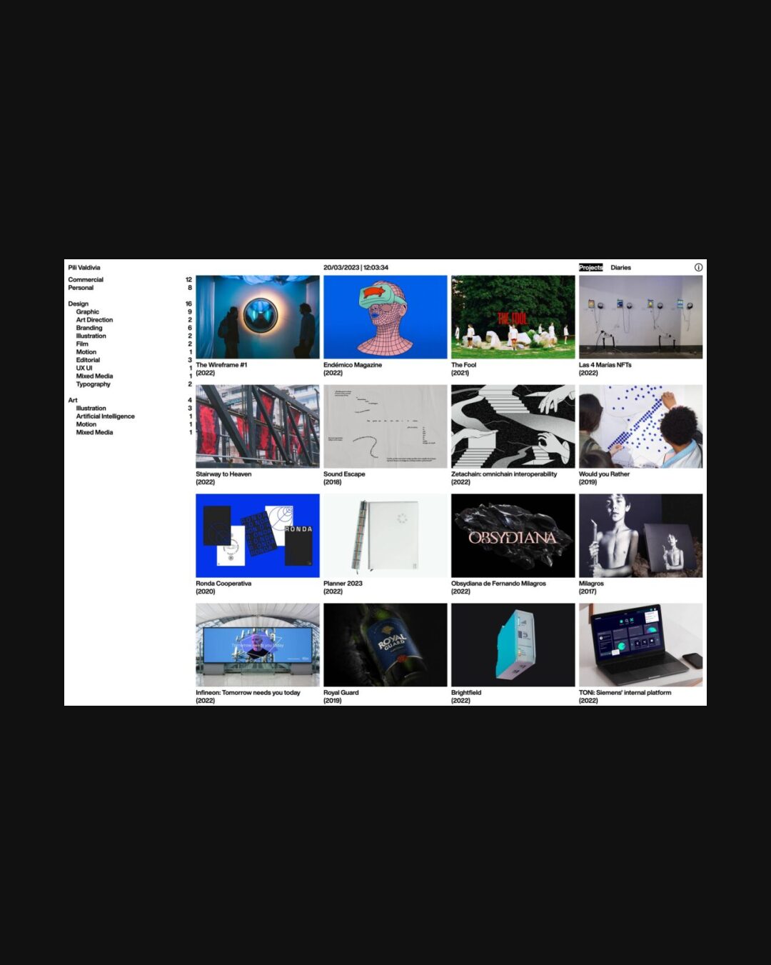 0605 pilivaldivia.com Design, Grid, Large Scale, Light, Simple, Small Typography, Black, Gray, Silver, White, Germany. Design: Pedro Meireis, Pili Valdivia. Development: Pedro Meireis. (20-03-2023) ←Close