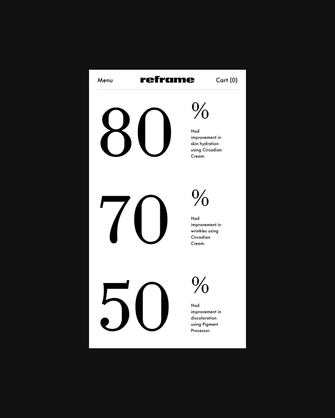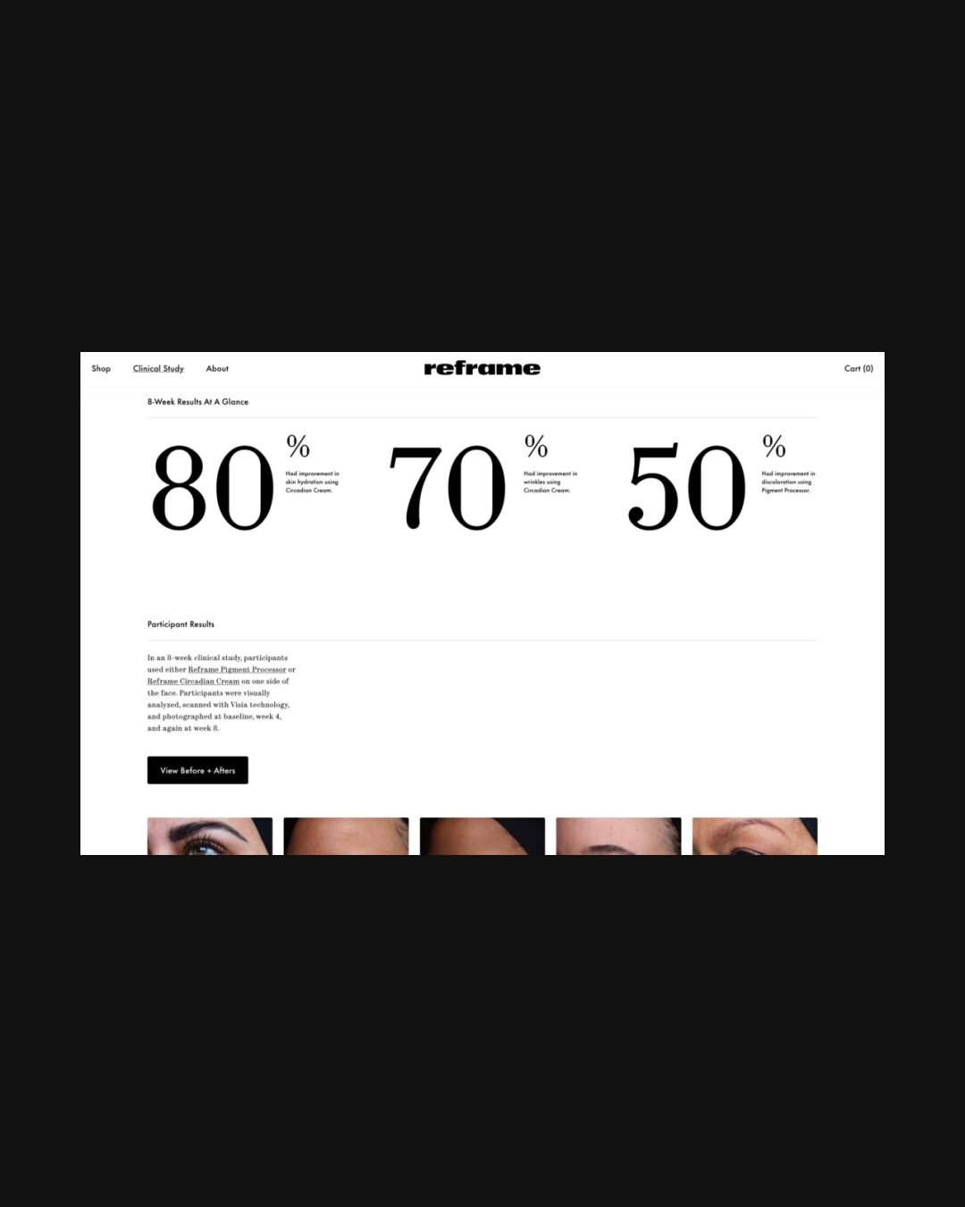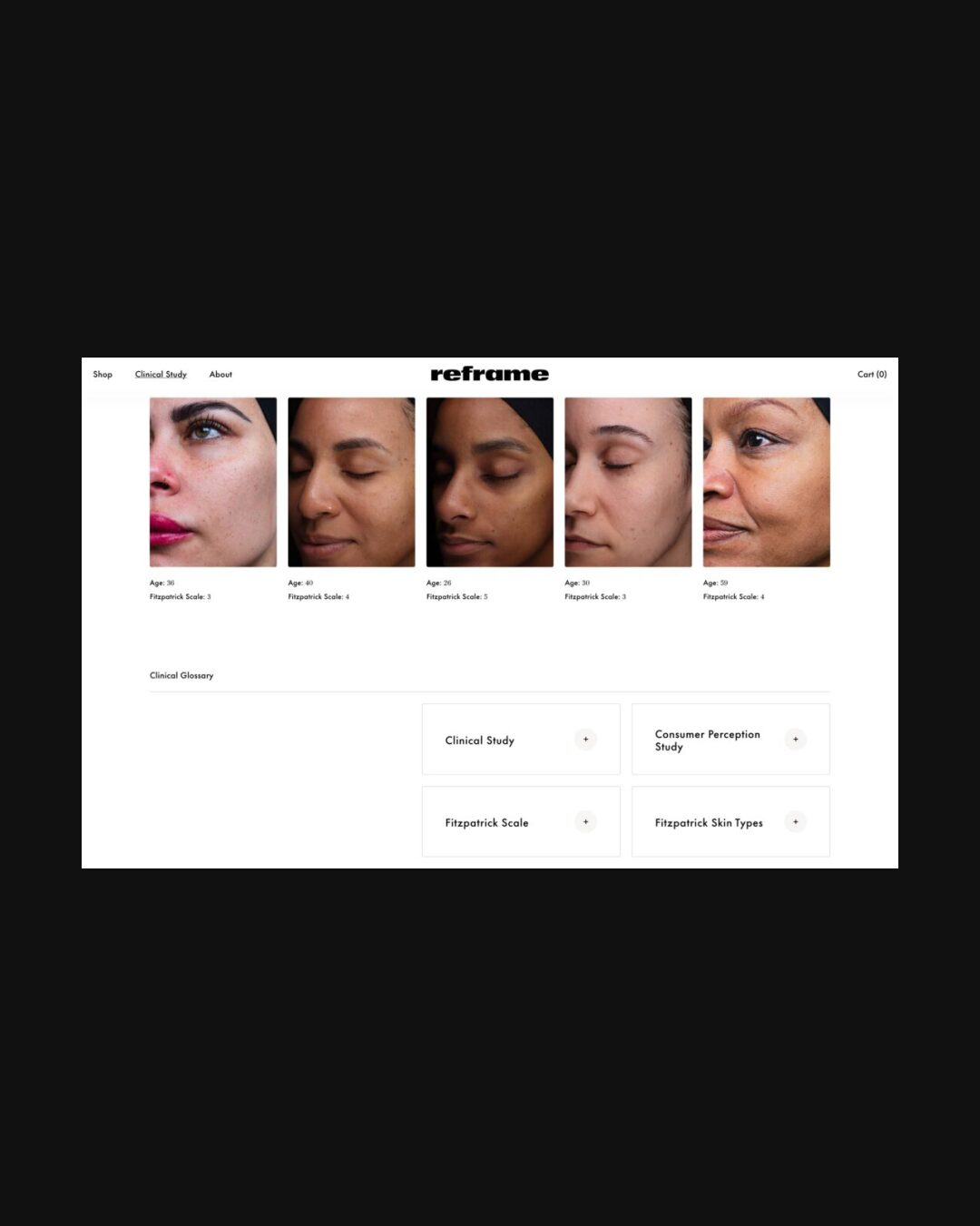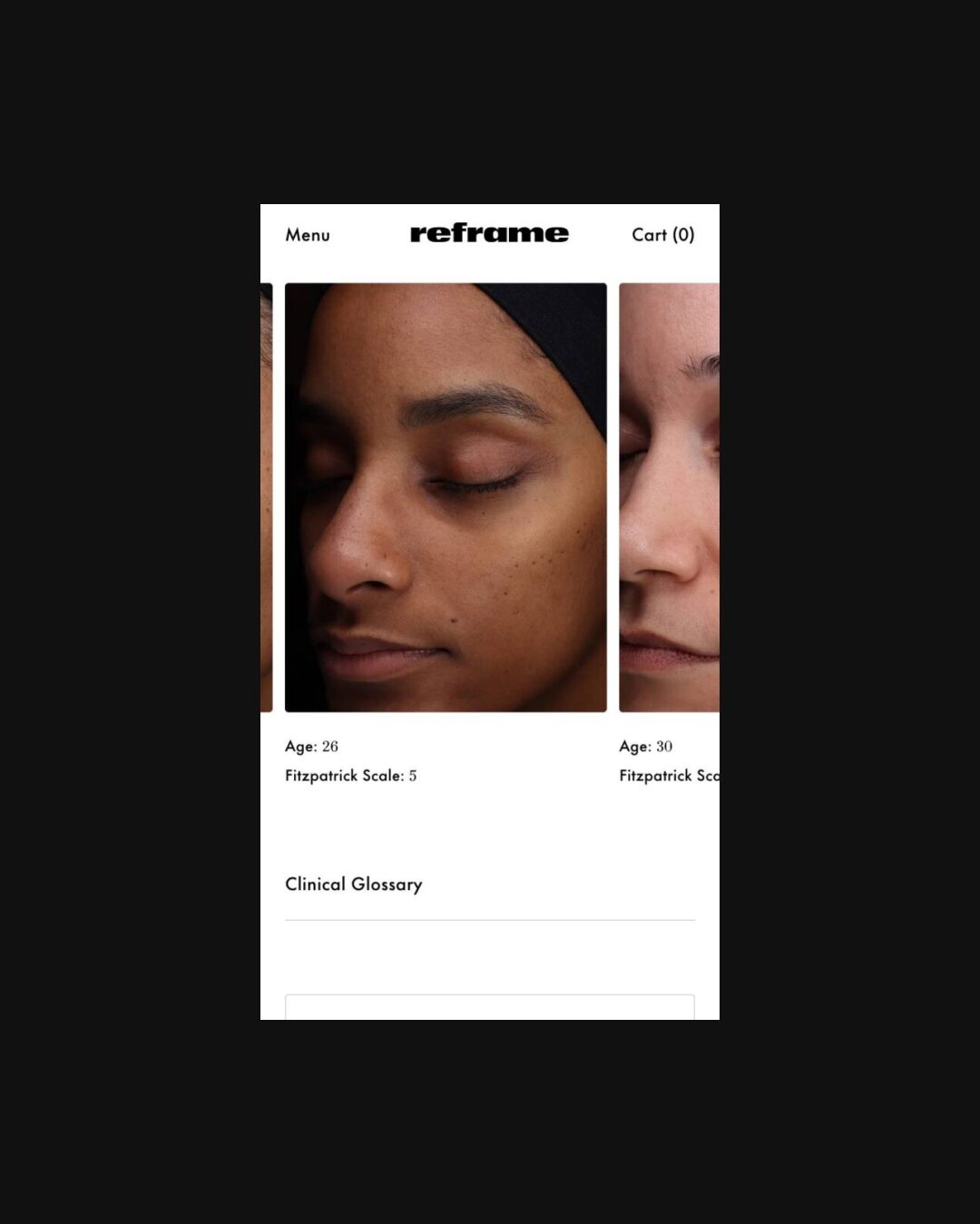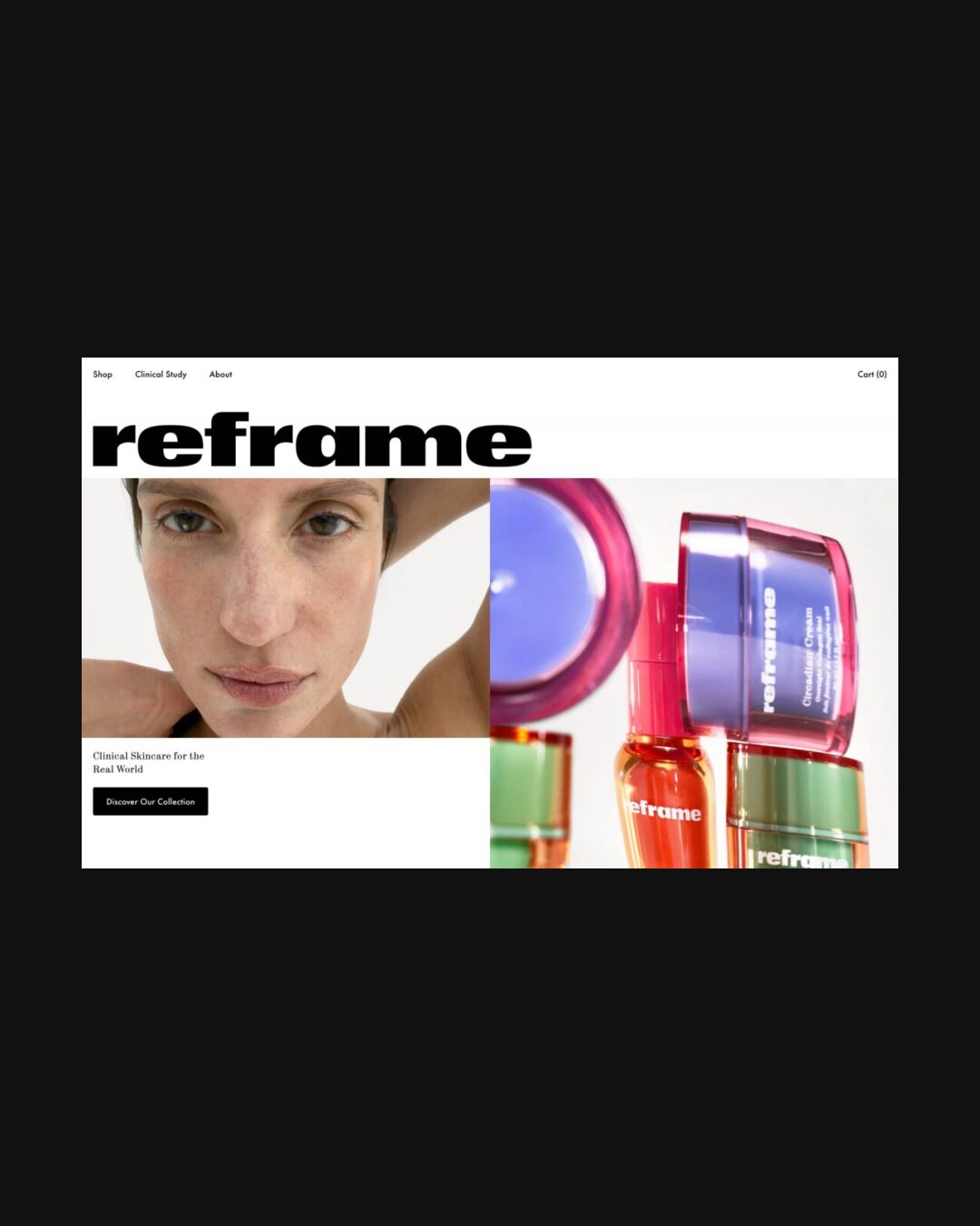 1188 reframebeauty.com Skincare, Big Title, Bright, Clean, Large Scale, Light, Sans Serif Typeface, Scroll Events, Slider, Table, White Space, Coffee, White, USA. Design: Brian Roettinger, Mouthwash Studio, Seriousandly. Development: Mouthwash Studio, Rafa Cobiella. (30-06-2025) ←Close