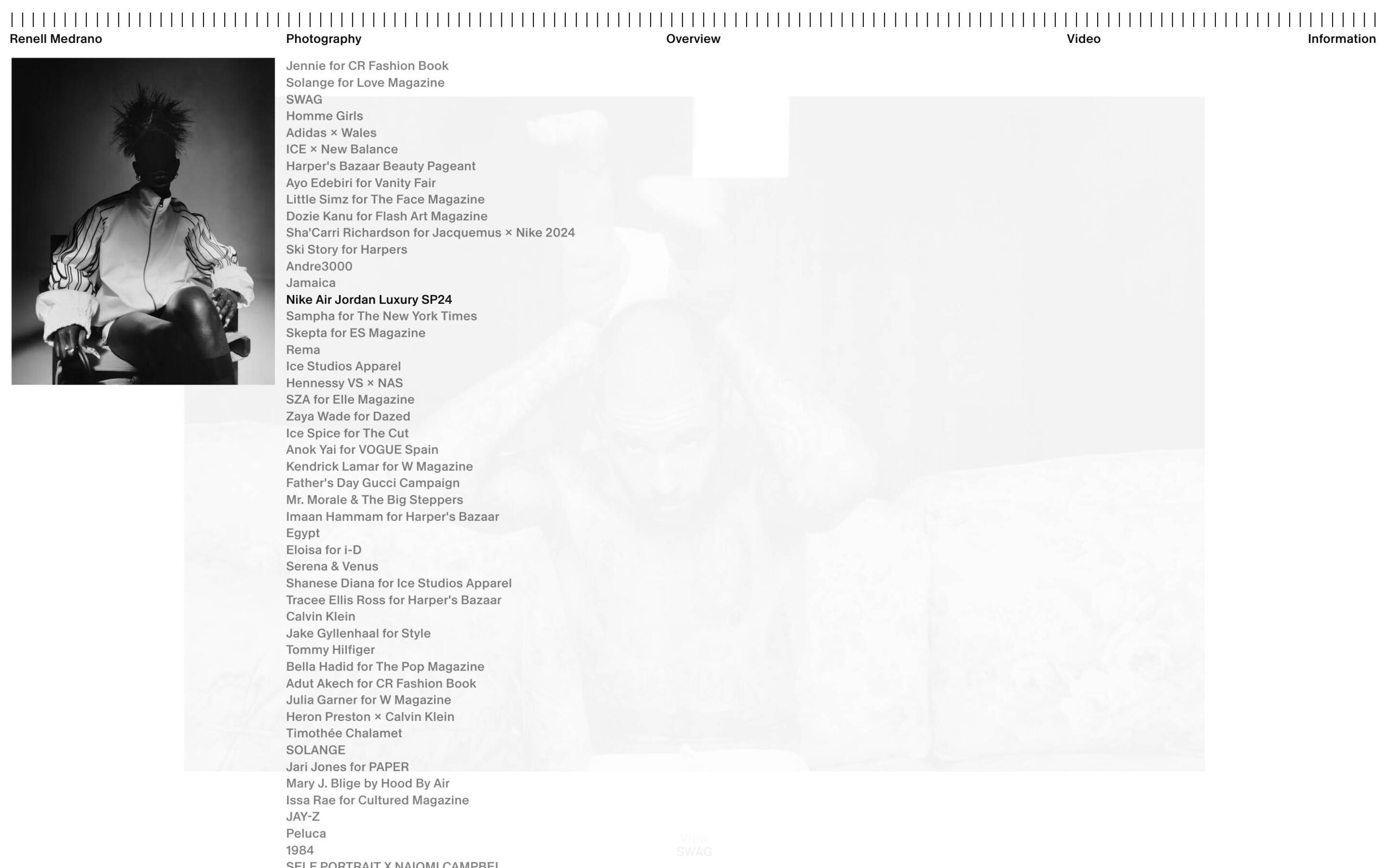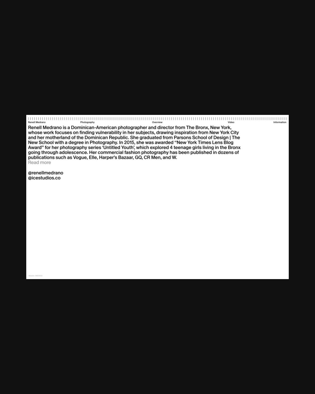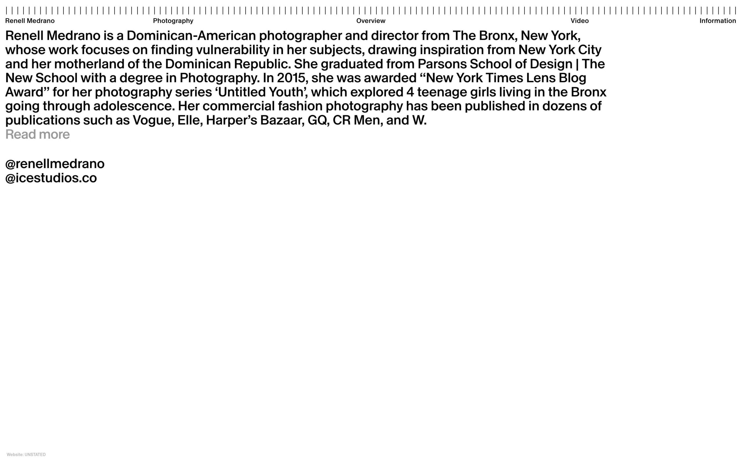 1312 renellmedrano.com Photography, Animations, Bold, Clean, Grid, Large Scale, Layered, Light, List, Minimal, Overlay Containers, Sans Serif Typeface, Small Typography, Technical, White Space, Black, White, USA. Design: Unstated. Development: Unstated. (06-12-2025) ←Close