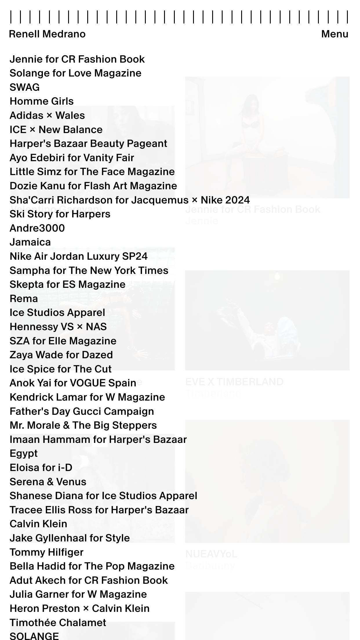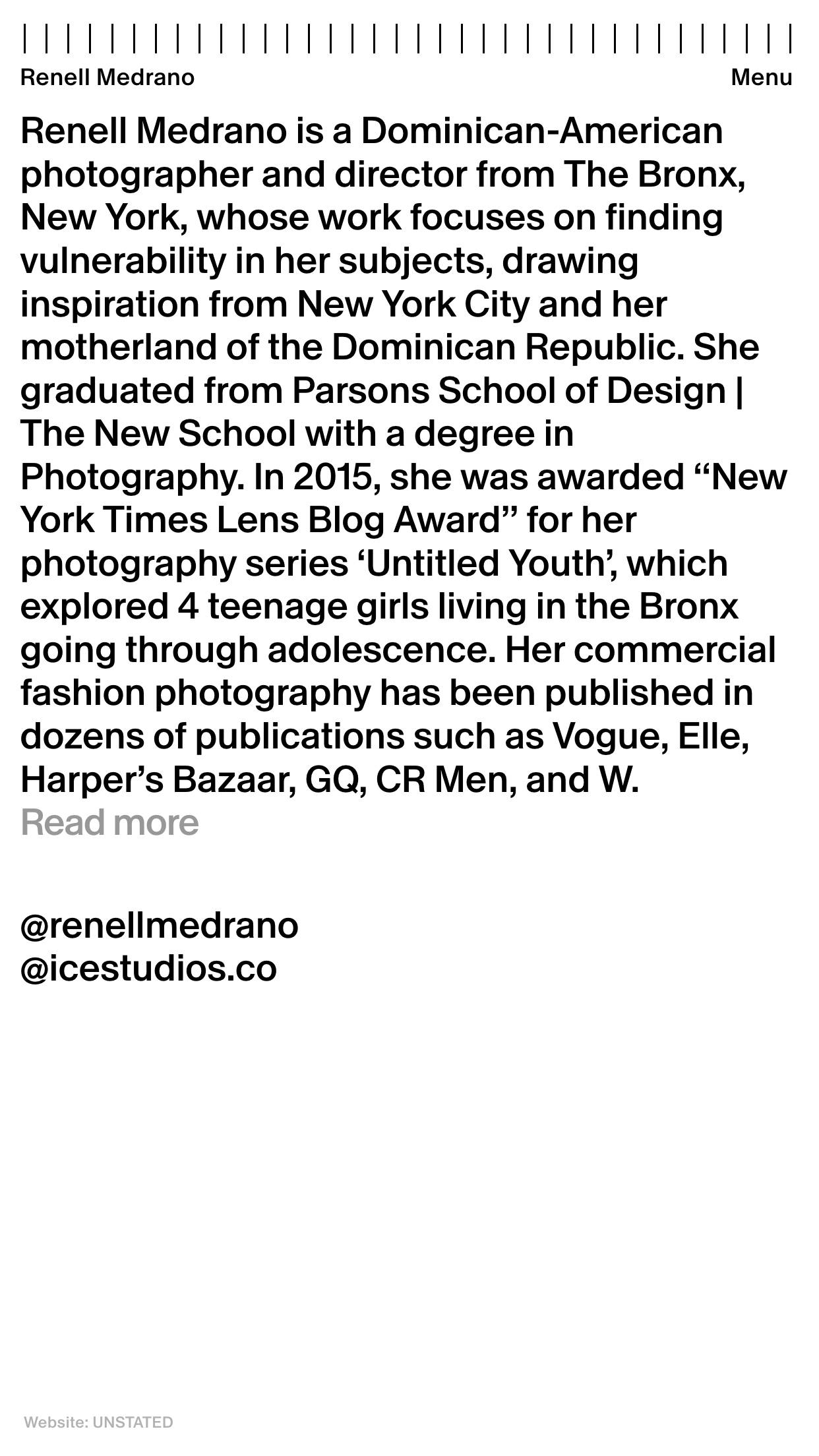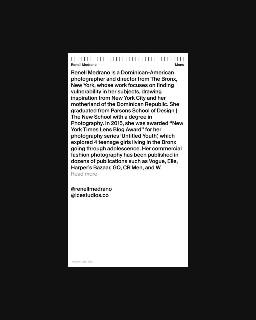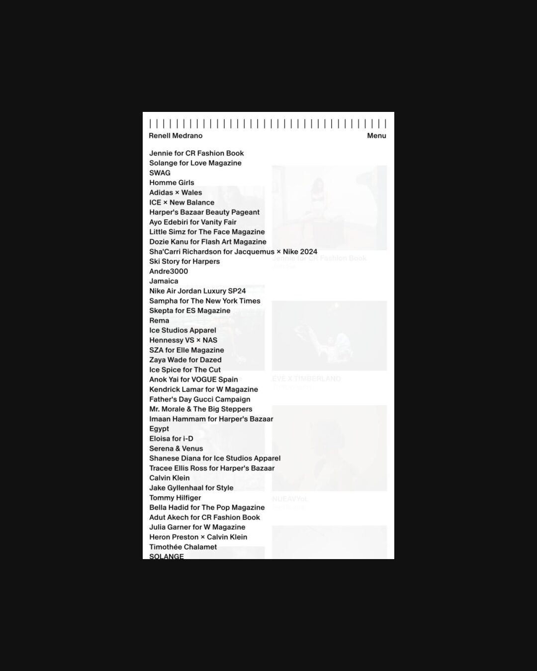 1312 renellmedrano.com Photography, Animations, Bold, Clean, Grid, Large Scale, Layered, Light, List, Minimal, Overlay Containers, Sans Serif Typeface, Small Typography, Technical, White Space, Black, White, USA. Design: Unstated. Development: Unstated. (06-12-2025) ←Close