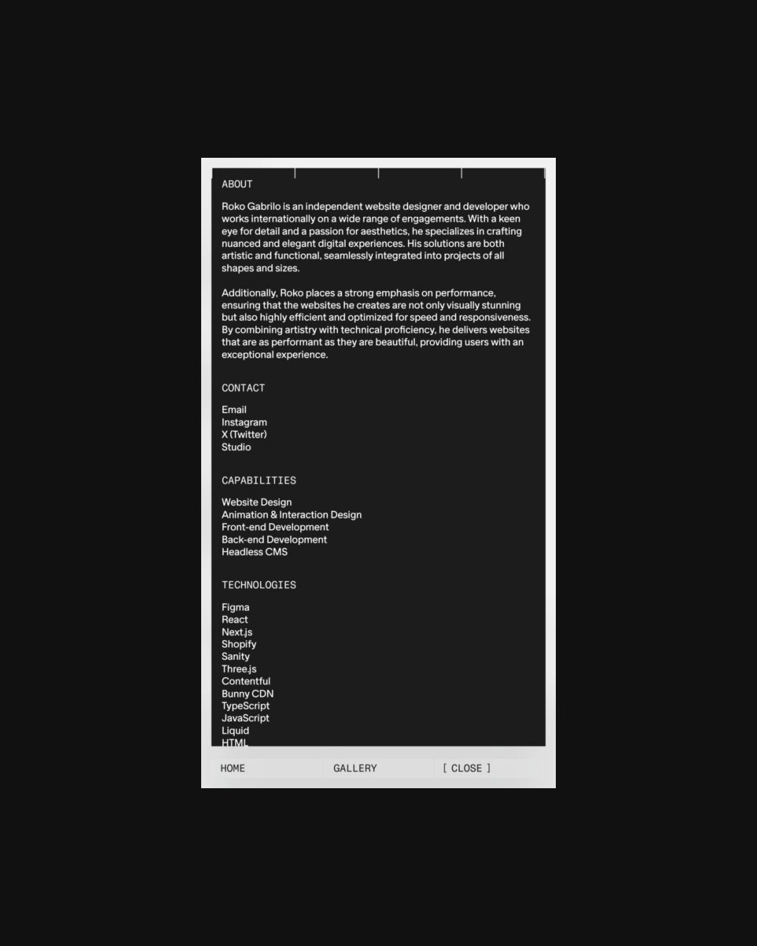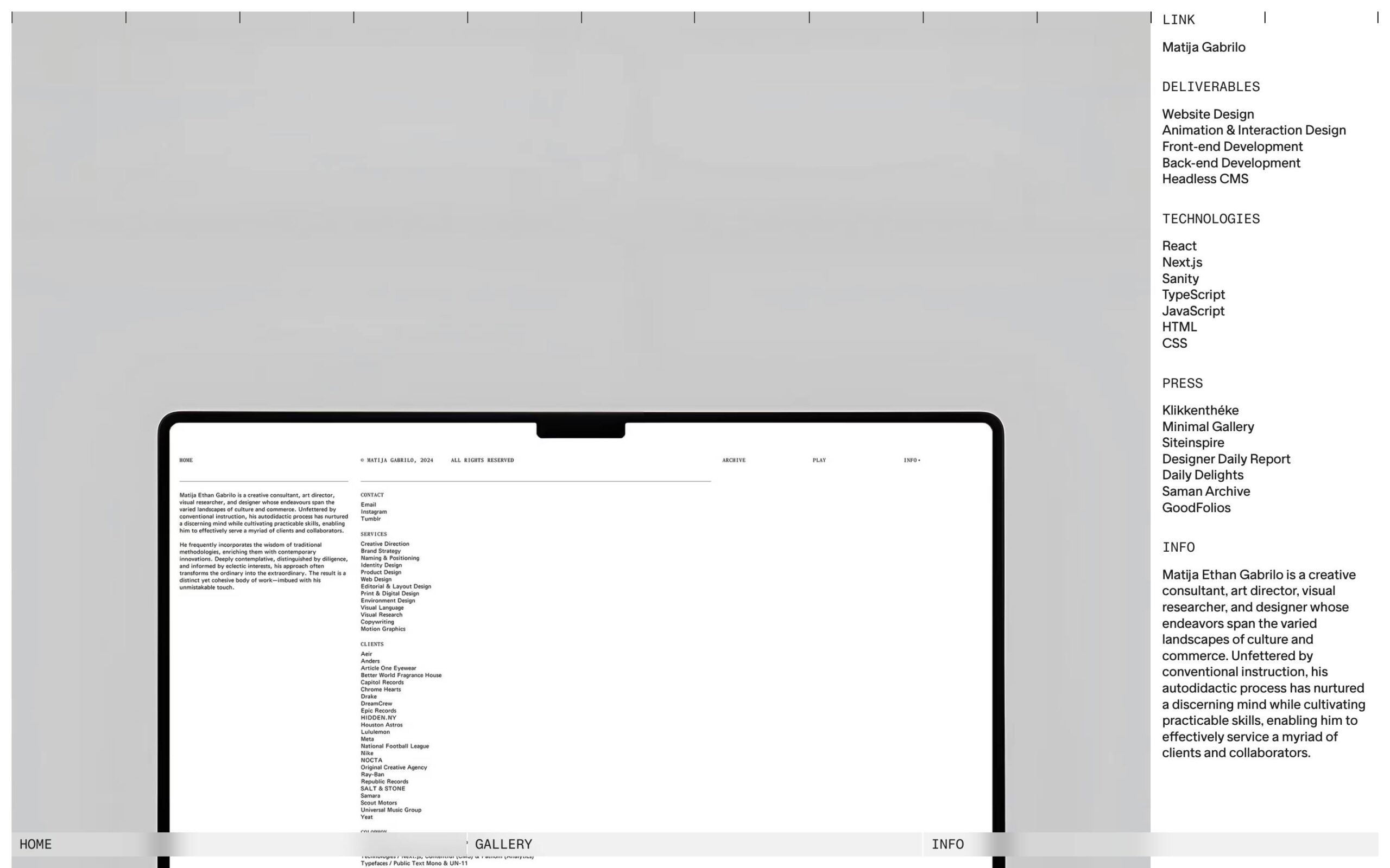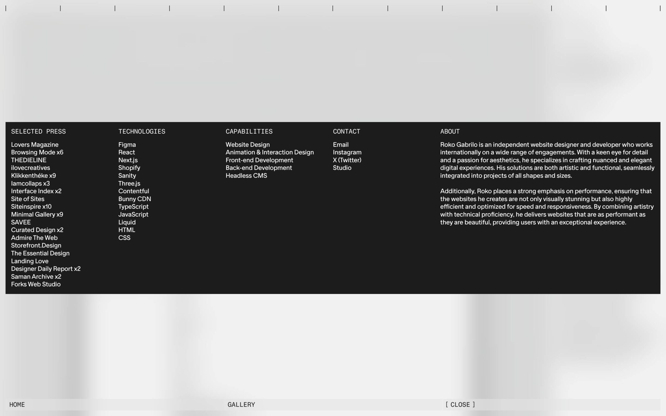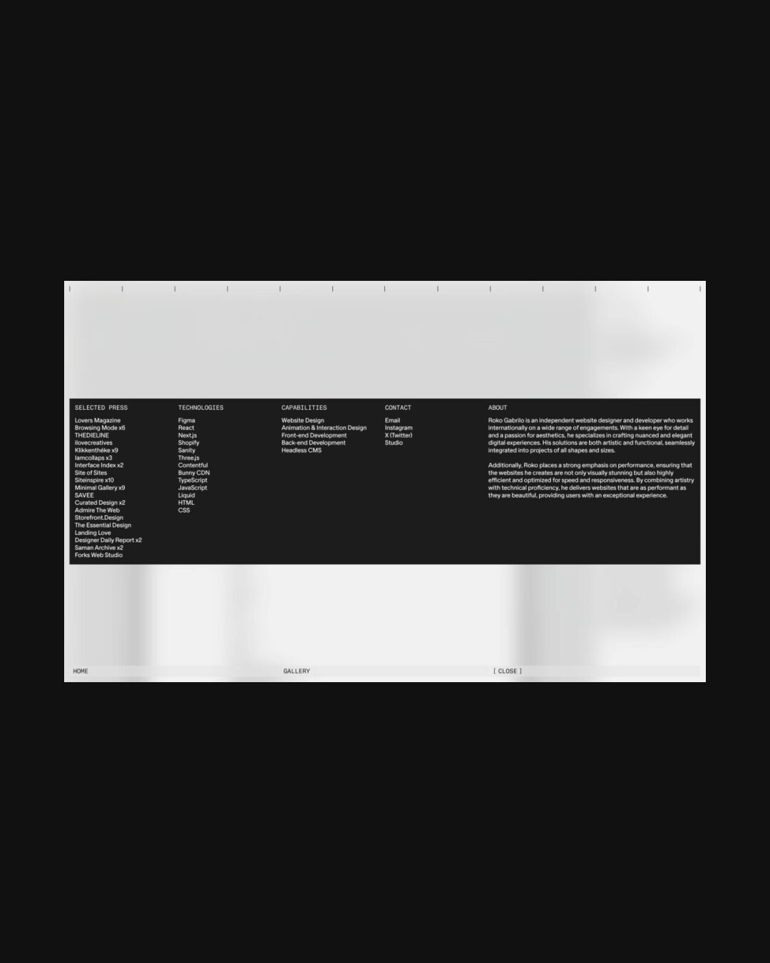 0954 roko-g.work Development, Blur, Clean, Grid, Large Scale, Layered, Light, List, Minimal, One Page, Sans Serif Typeface, Scroll Events, Simple, Small Typography, Technical, Video, White Space, Silver, White, Canada. Design: Roko Gabrilo. Development: Roko Gabrilo. (20-11-2024) ←Close
