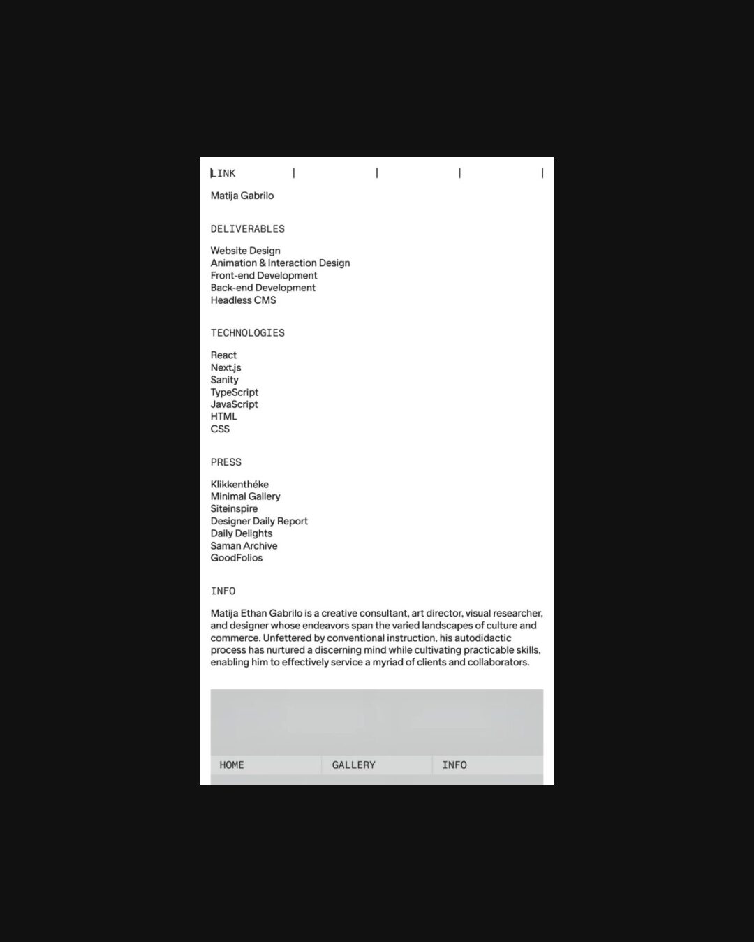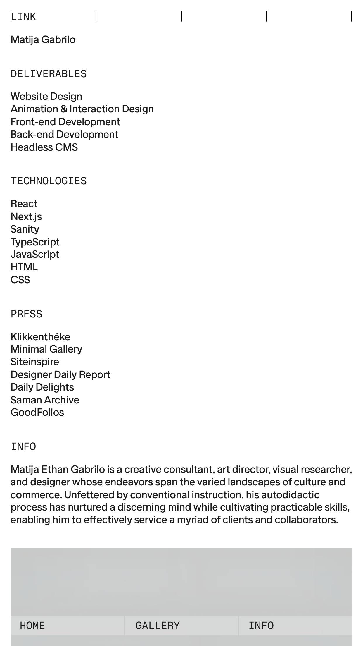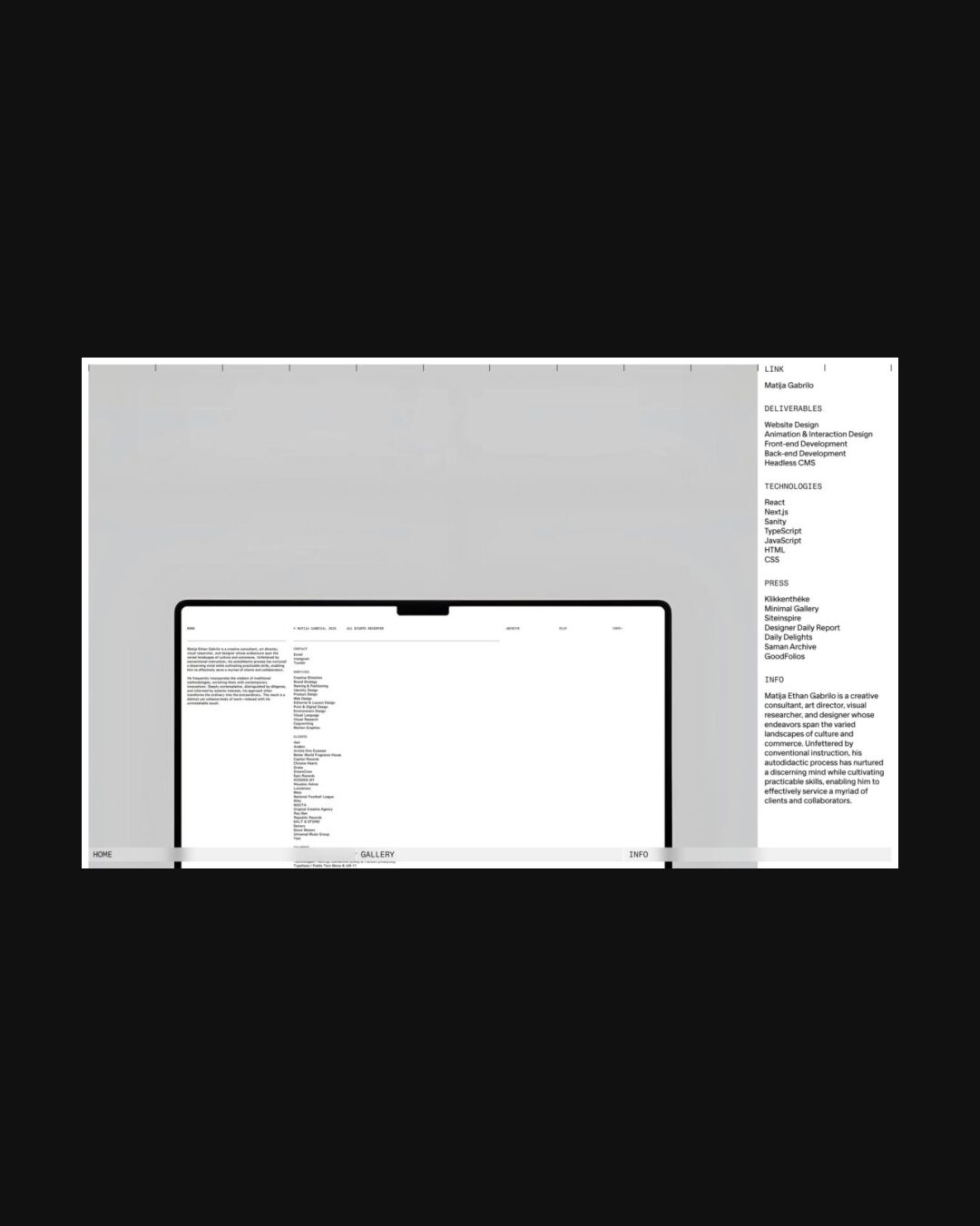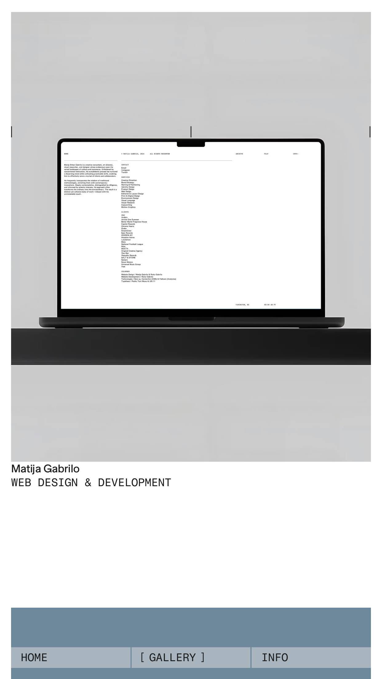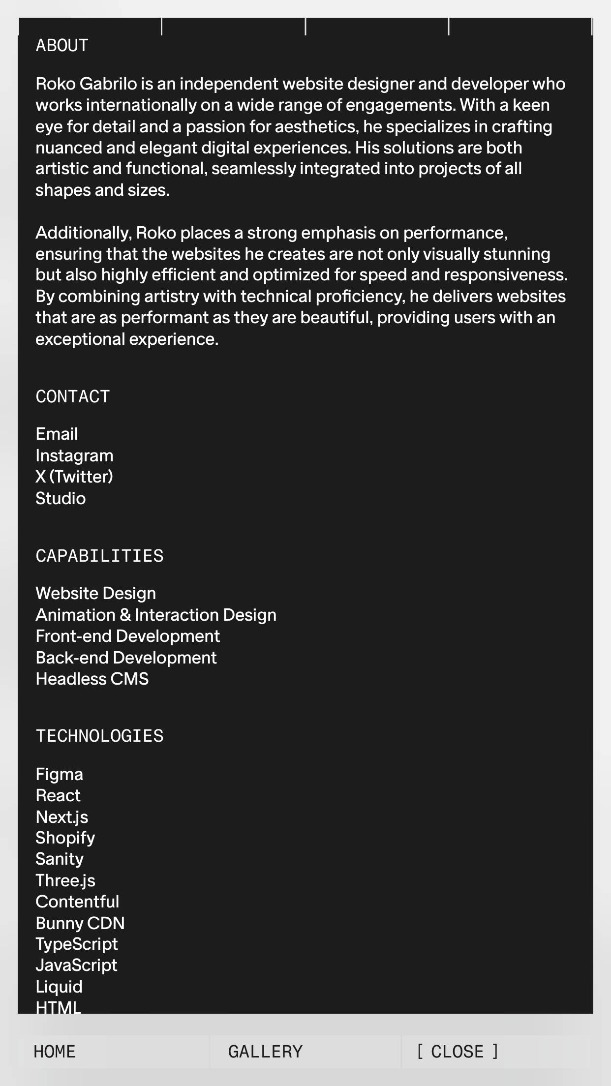 0954 roko-g.work Development, Blur, Clean, Grid, Large Scale, Layered, Light, List, Minimal, One Page, Sans Serif Typeface, Scroll Events, Simple, Small Typography, Technical, Video, White Space, Silver, White, Canada. Design: Roko Gabrilo. Development: Roko Gabrilo. (20-11-2024) ←Close