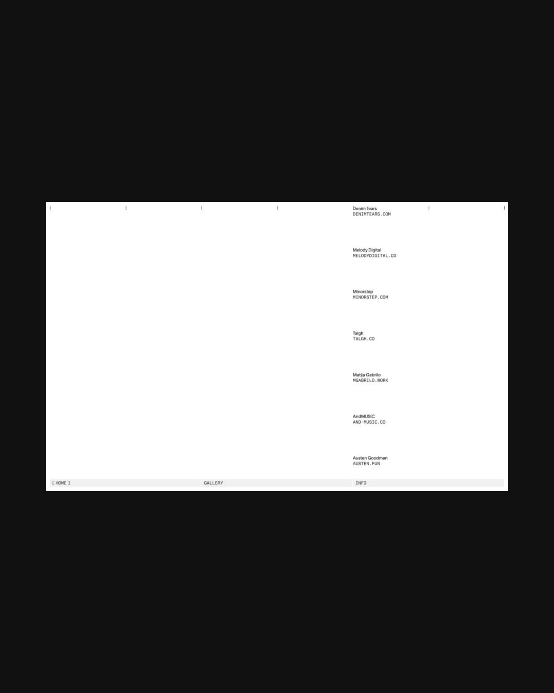 #3D #Animations #Ascii #Asymmetrical Grid #Audio #Bauhaus #Big Images #Big Title #Big Typography #Black & White #Blocks #Blur #Bold #Bright #Brutalist #Buttons #Camera Tracking #Clean #Clock #Collage #Collapsing containers #Colorful #Creative Layout #Cursor Follow #Custom Cursor #Custom Scroll #Dadaist #Dark #Draggable Elements #Duo-tone #E-commerce #Editorial #Forms #Gradient #Grainy #Gray #Grid #Gritty #Halftone #Holding Page #Horizontal Scroll #Hover Events #Illustrations #Industrial #International Style #Large Scale #Layered #Light #List #Lo-FI #Lowercase #Map #Marquee #Mask #Mini Site #Minimal #Mixed Style Typefaces #Mode Switch #Mono Typeface #Monotone #Motion #Multicolor #Newspaper #One Page #Opacity #Overlay Containers #Page Transitions #Parallax #Pattern #Pixelated #Playful #Retro #Rotated Text #Rounded Corners #Sans Serif Typeface #Scaling #Scroll Events #Scroll Position Animation #Scroll Snap #Serif Typeface #Shapes #Simple #Slider #Small Typography #Split Scroll #Sticky Elements #Stretched Text #Table #Technical #Technologic #Text Highlight #Text Only #Thin #Timeline #Transform #Typographic #Uppercase #Variable Title #Vertical Text #Video #White Space #Y Scroll