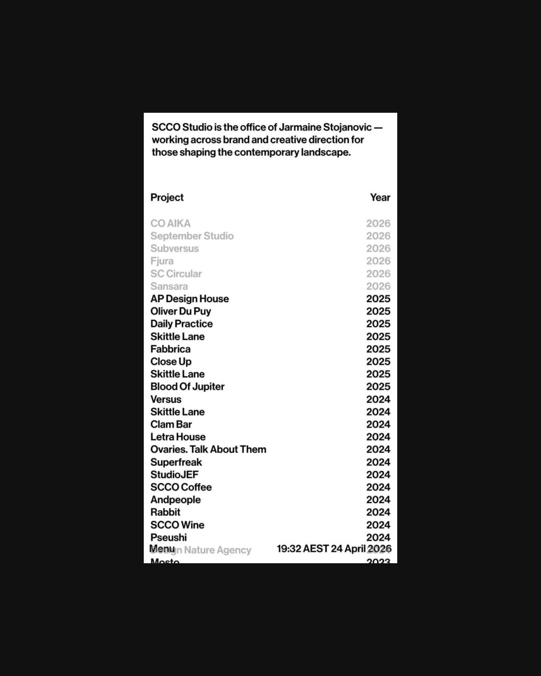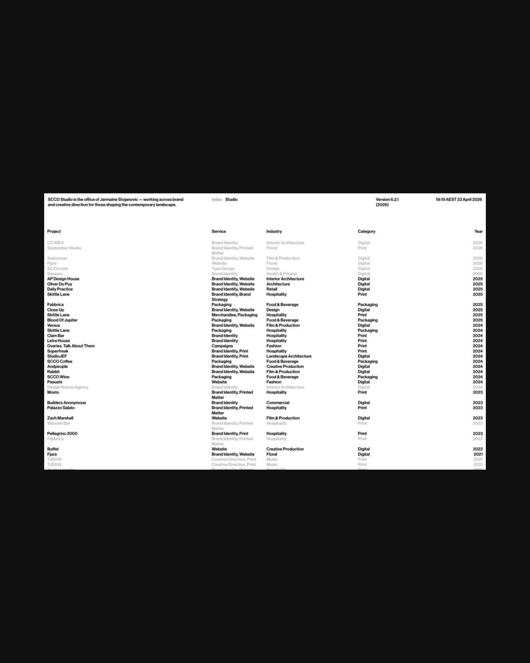 1336 scco.studio Design, Brutalist, Grid, Industrial, Large Scale, Layered, Light, List, Minimal, Overlay Containers, Sans Serif Typeface, Simple, Small Typography, Technical, Typographic, Black, White, Australia. Design: SCCO Studio. Development: SCCO Studio. (25-04-2026) ←Close