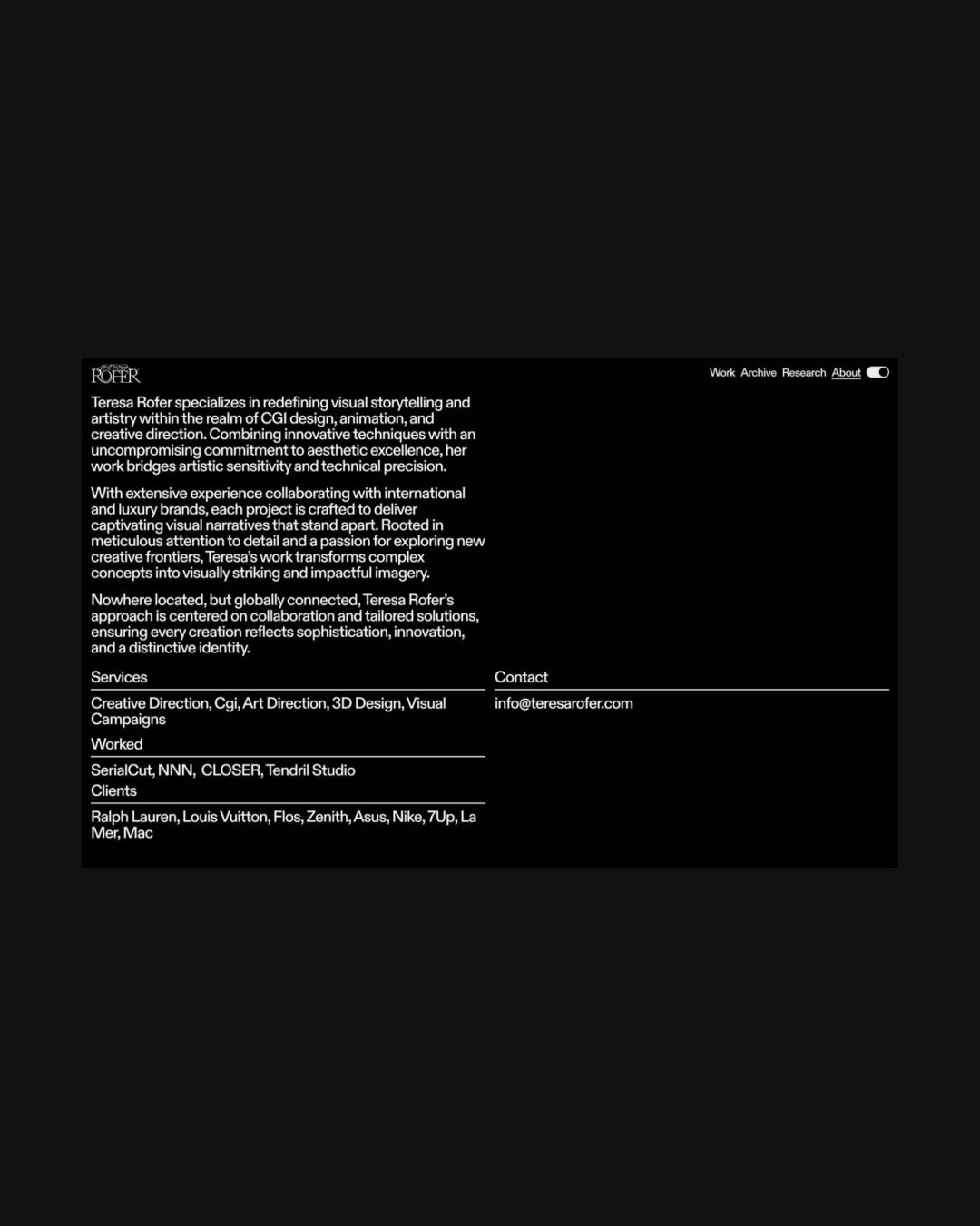 1254 teresarofer.com Motion Designer, Brutalist, Dark, Grid, Large Scale, Sans Serif Typeface, Simple, Video, Black, Spain. Design: Tasio Calvo. Development: Tasio Calvo. (10-09-2025) ←Close